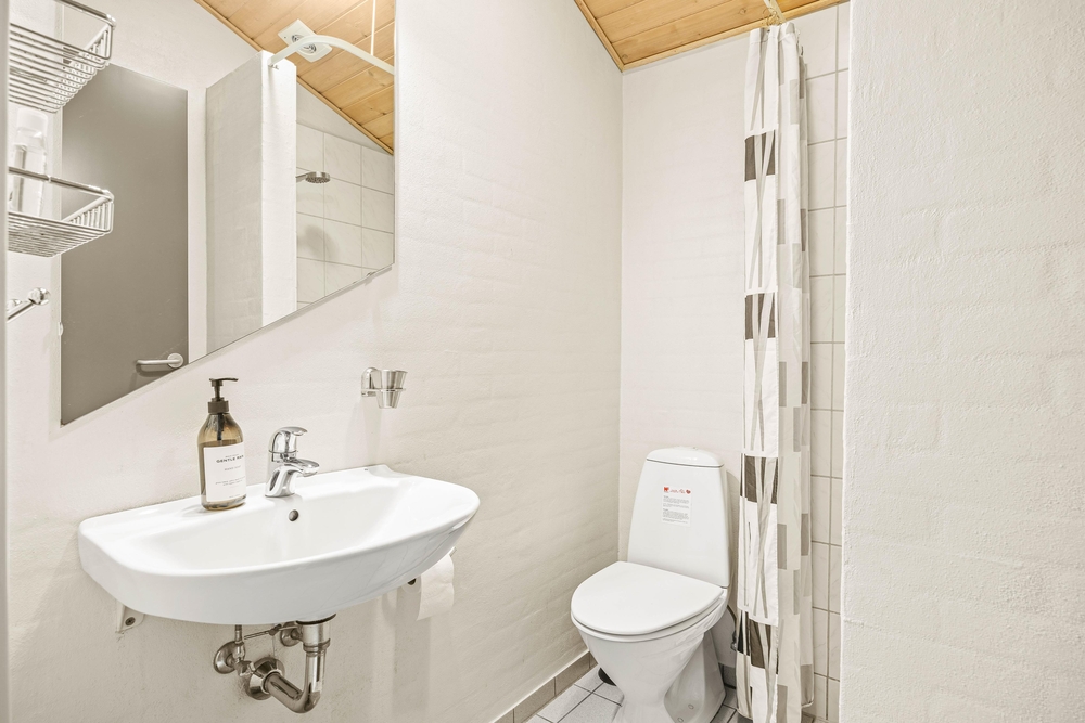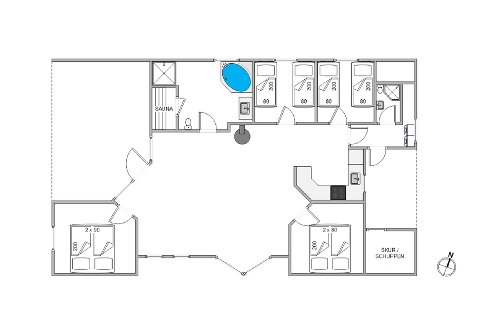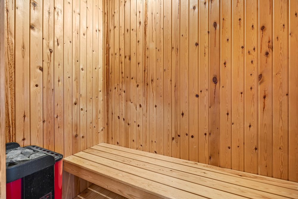 Die hellgefliesten Badezimmer verfügen beide über eine Fußbodenheizung und eine Dusche. Im großen Badezimmer habt ihr einen direkten Zugang zur Sauna und zum Whirlpool des Hauses, wo zwei Personen Platz finden. Praktischerweise gibt es eine Waschmaschine und einen Wäschetrockner im Ferienhaus sowie eine energiesparende Wärmepumpe, die schnell und effizient für ein angenehmes Raumklima und eine gute Temperatur sorgt.