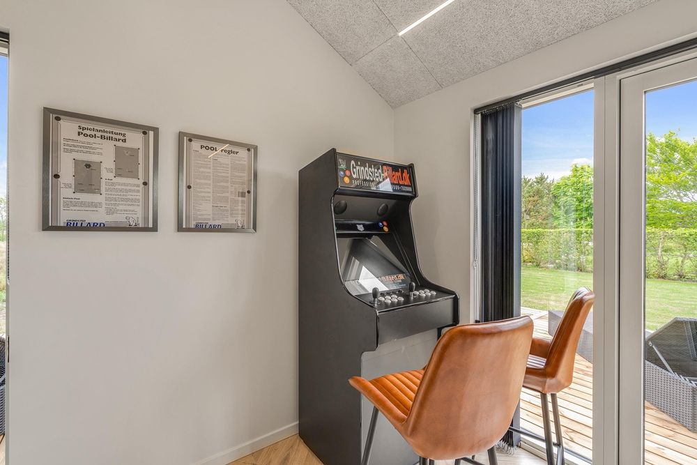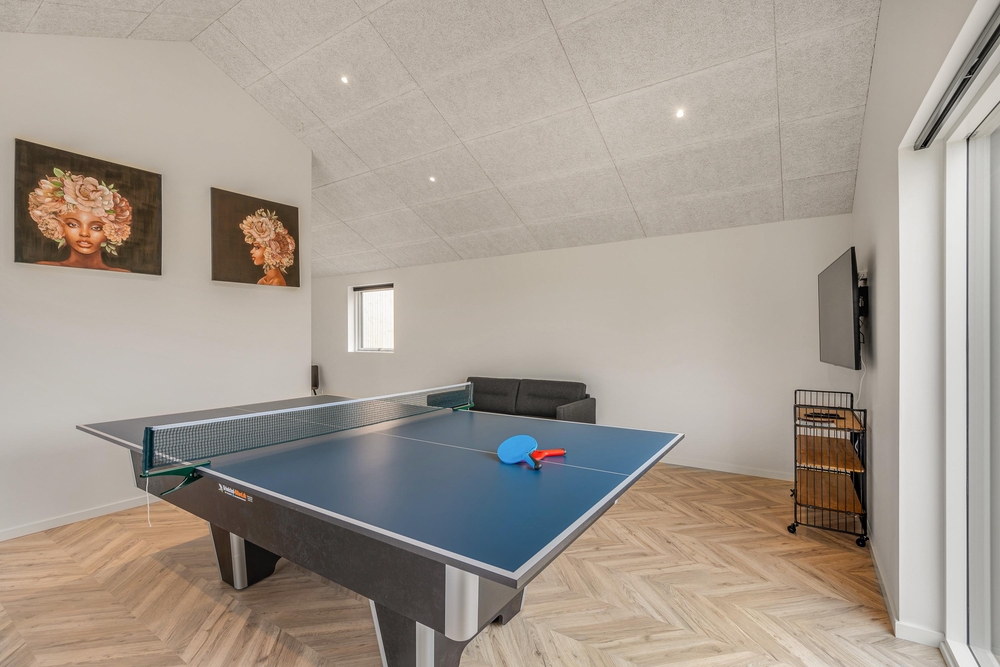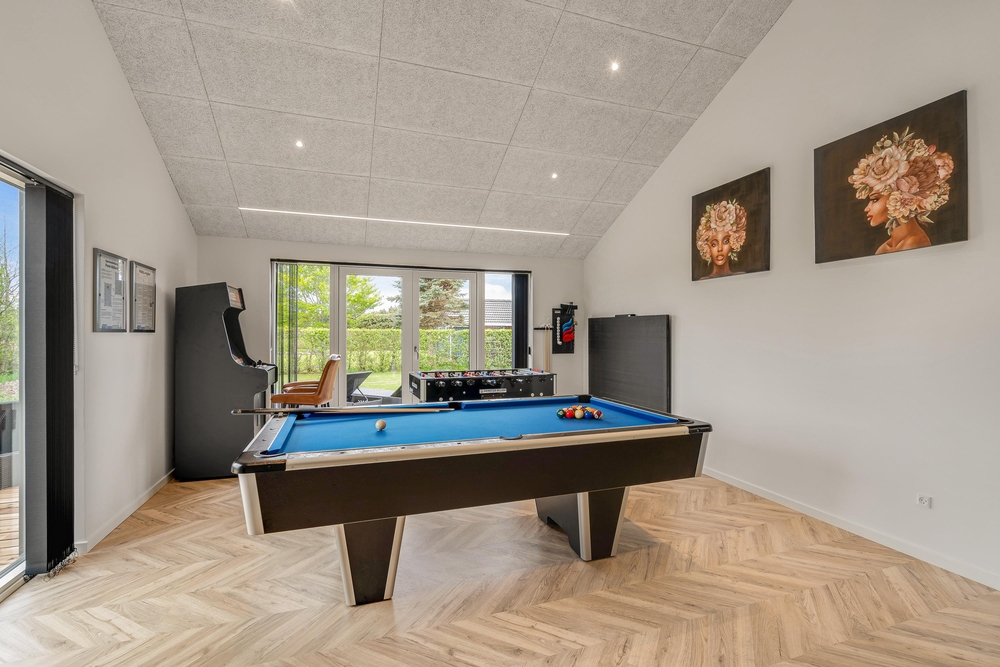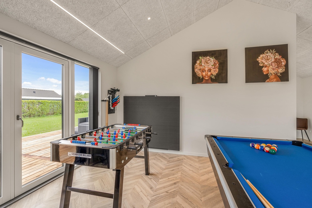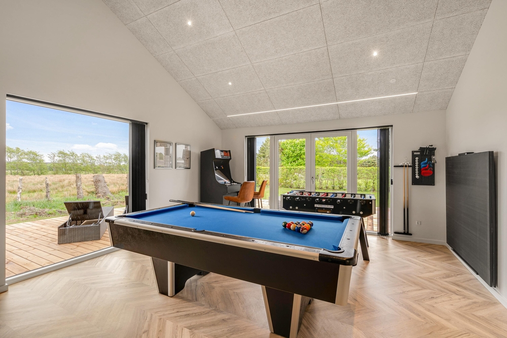 Im Wohnbereich stehen gemütliche gemeinsame Stunden auf dem Programm, ob bei gemeinsamen Mahlzeiten, Film- oder Spielabenden. Die gediegene Ausstattung, die sich wie ein roter Faden durch das ganze Ferienhaus zieht, ist komplett darauf ausgerichtet, dass ihr eine tolle Zeit miteinander verbringt und euch rundum wohlfühlt, egal ob euch der Sinn nach Entspannung oder Aktivität steht. Wie wäre es z.B. mit einem Billardturnier mit kalten Getränken und Snacks?