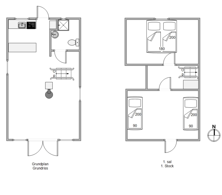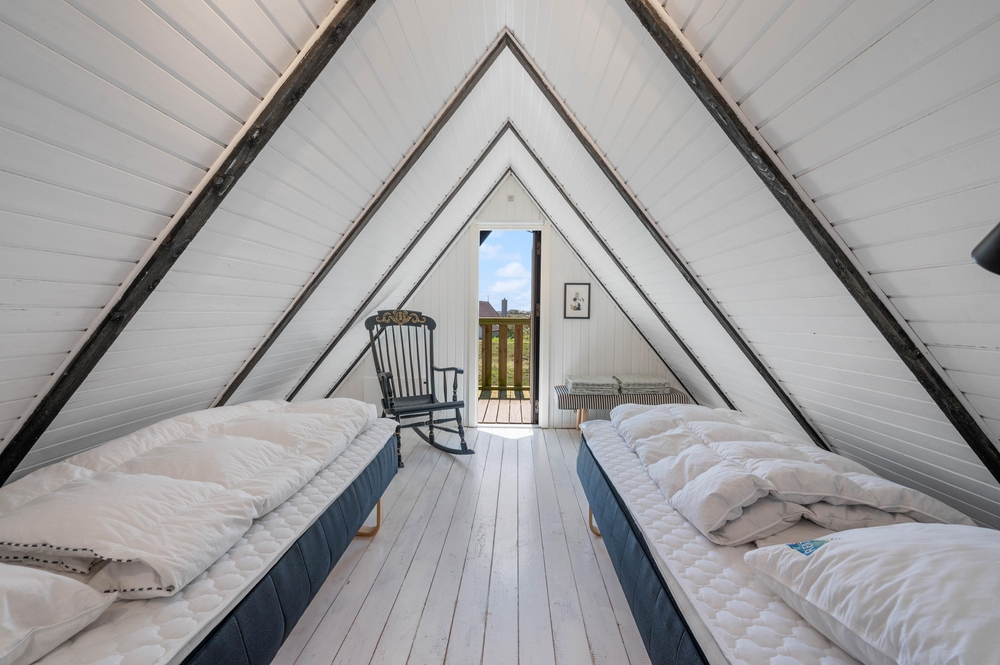 Gleich hinter dem Kaminofen führt eine Treppe zu den 2 Schlafzimmern im Spitzboden. Eines der Schlafzimmer bietet ein Doppelbett und das andere zwei Einzelbetten, die man aber ohne weiteres zusammenschieben kann. Aufgrund der steilen Treppe ist dieses Ferienhaus nicht für Menschen mit gehbehinderung geeignet.