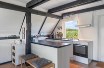 Im unteren Bereich des Hauses findet ihr das Duschbad und den offenen Wohn- und Essbereich im Anschluss zur offen gestalteten Küche. Die Küche ist kompakt, aber trotzdem mit Elektroherd, Spülmaschine und Kühlkombination ausgestattet.