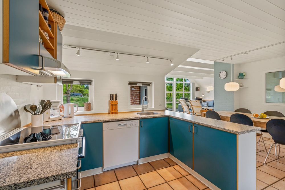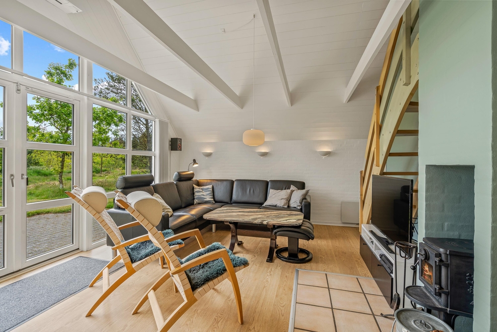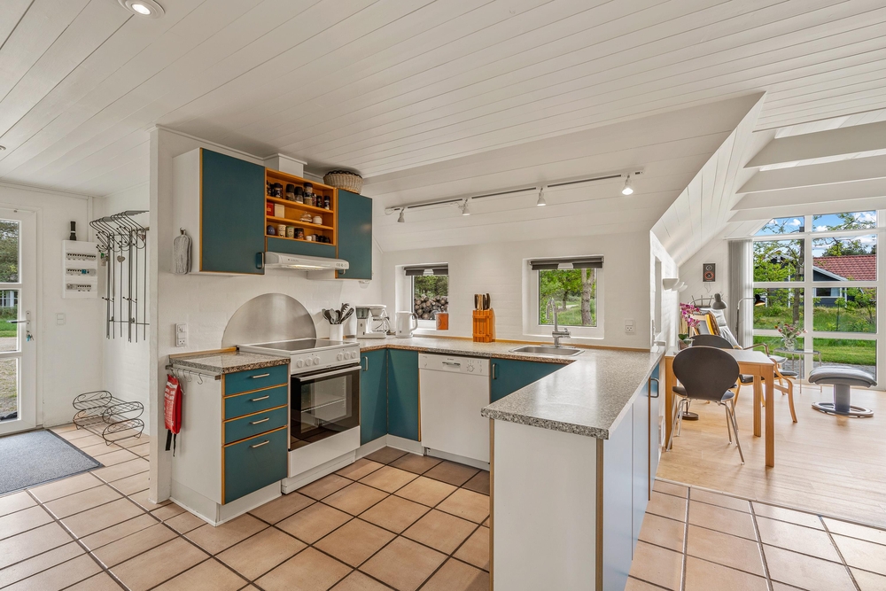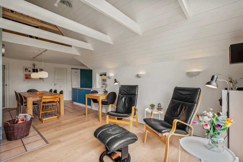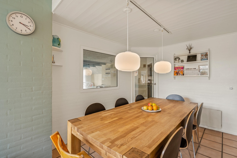 Guldvang 70 ist ein schönes grosses Haus, sodass mehrerer Familien hier Urlaub machen können. Das Ferienhaus verfügt über 4 räumliche Schlafzimmer und 2 Badezimmer mit Bodenheizung. 2 der Schlafzimmer sind im Obergeschoss zu finden. Die Küche steht in Offener Verbindung zum Essbreich und Wohnzimmer, sodass ihr einen guten Überblick über das Haus haben könnt, während ihr in der Küche euer Essen zubereitet.