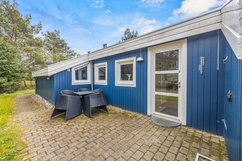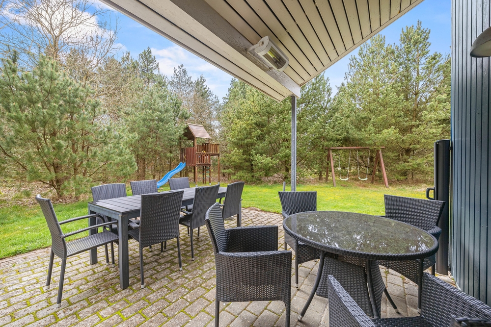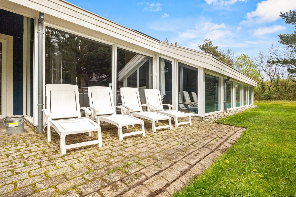 Auf zwei Seiten eures Ferienhauses findet ihr Terrassen vor, von denen eine sogar teils überdacht ist. So könnt ihr, je nach Sonnenstand und Windrichtung, stets einen schönen Platz im Freien finden. Macht es euch in den Gartenmöbeln bequem oder schnappt euch eine der Sonnenliegen für ein Sonnenbad. Dank der Büsche und Bäume um euer 1679 qm großes Grundstück, könnt ihr eure Privatsphäre genießen.