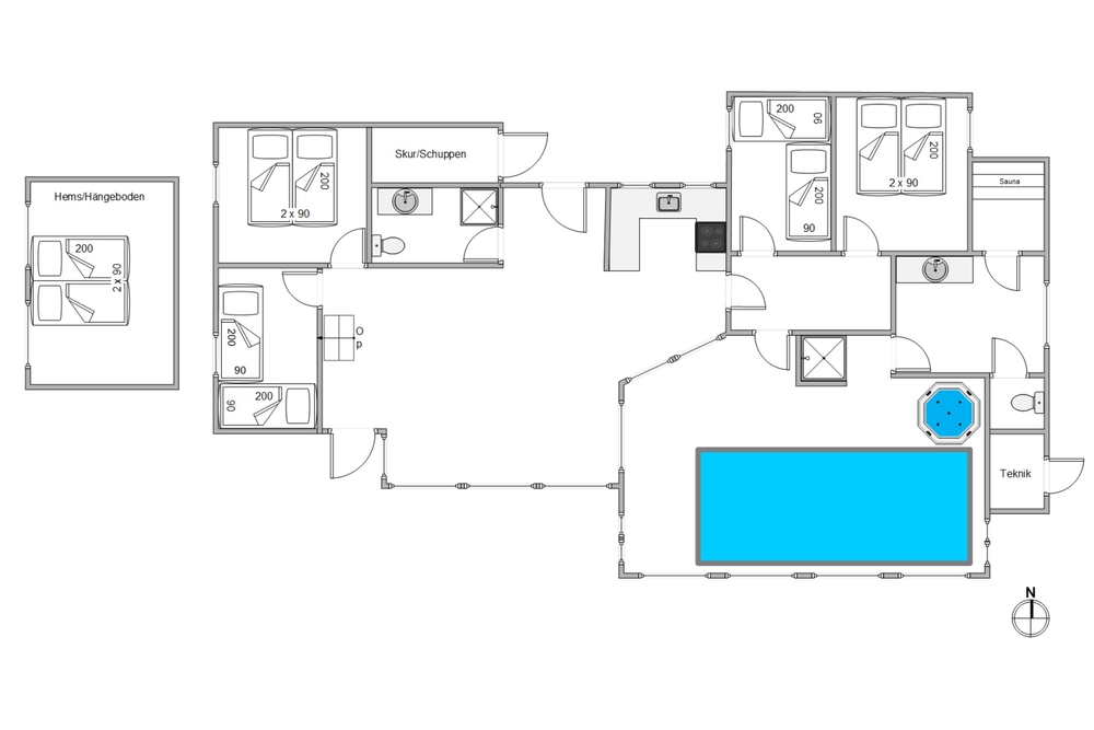 Oder ihr genießt ein Bad im warmen Wasser des Whirlpools. Eure Kinder können derweil im Pool planschen und die Rutsche ausprobieren. Wollt ihr euch sportlich betätigen, so könnt ihr die Gegenstromanlage anschalten. Nach einem abwechslungsreichen Tag an der dänischen Westküste, könnt ihr euch auf vier gemütliche Schlafzimmer aufteilen. Es gibt zwei Doppelbettschlafzimmer und zwei Schlafzimmer mit je zwei bequemen Einzelbetten in eurem Feriendomizil. Darüber hinaus findet ihr auf dem Hems zwei weitere Schlafmöglichkeiten in Form von MemoryFoam-Matratzen.