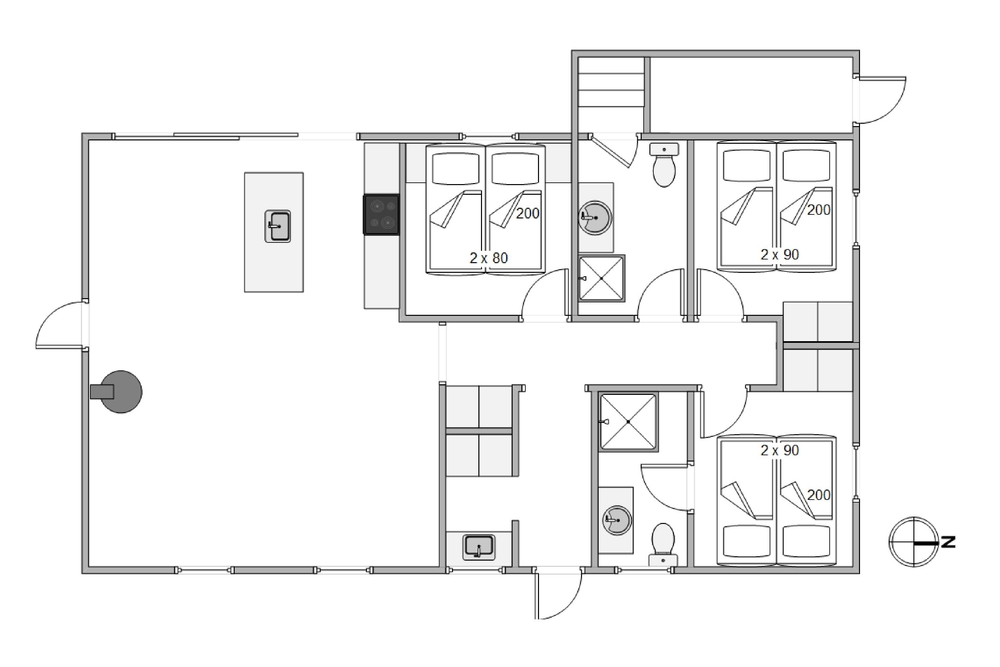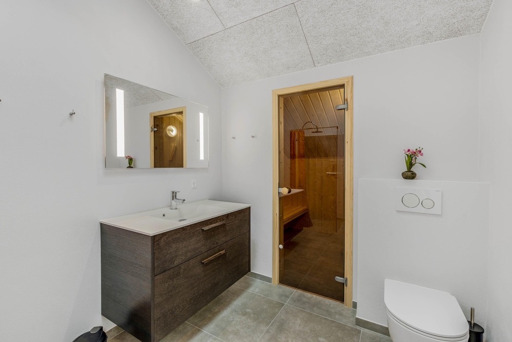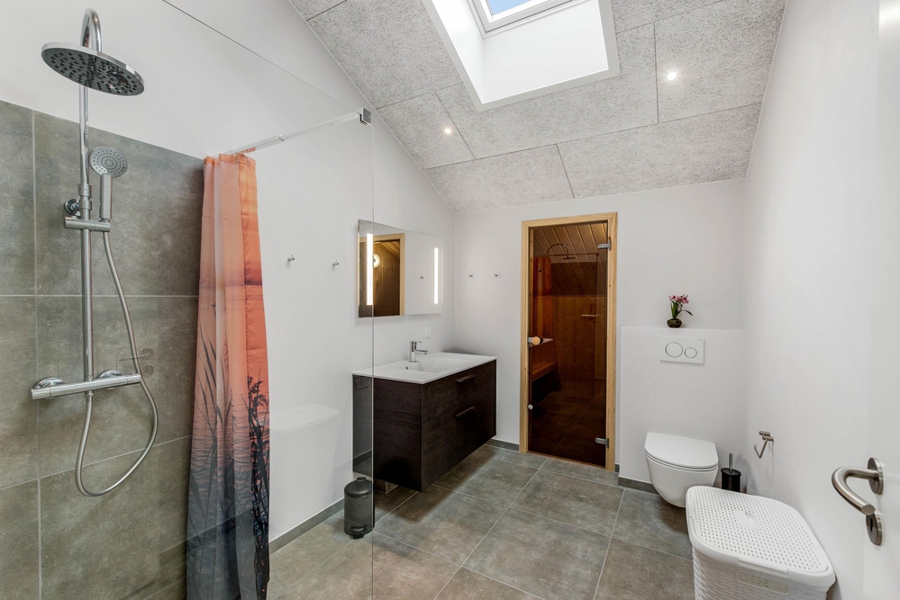 Es stehen euch 3 Schlafzimmer mit je einem Doppelbett, sowie 2 Badezimmern, wobei eines einen Zugang zur Sauna hat zur Verfügung. In einem der Schlafzimmer erwartet euch ein extra Fernseher für entspannte Filmabende. Solltet ihr vom Wind ordentlich durchgepustet worden sein, könnt ihr euch in der wohlig warmen Sauna wieder aufwärmen oder ihr heizt den Kaminofen ein.