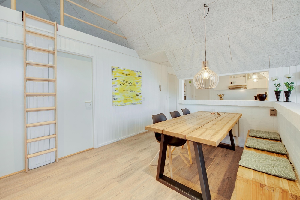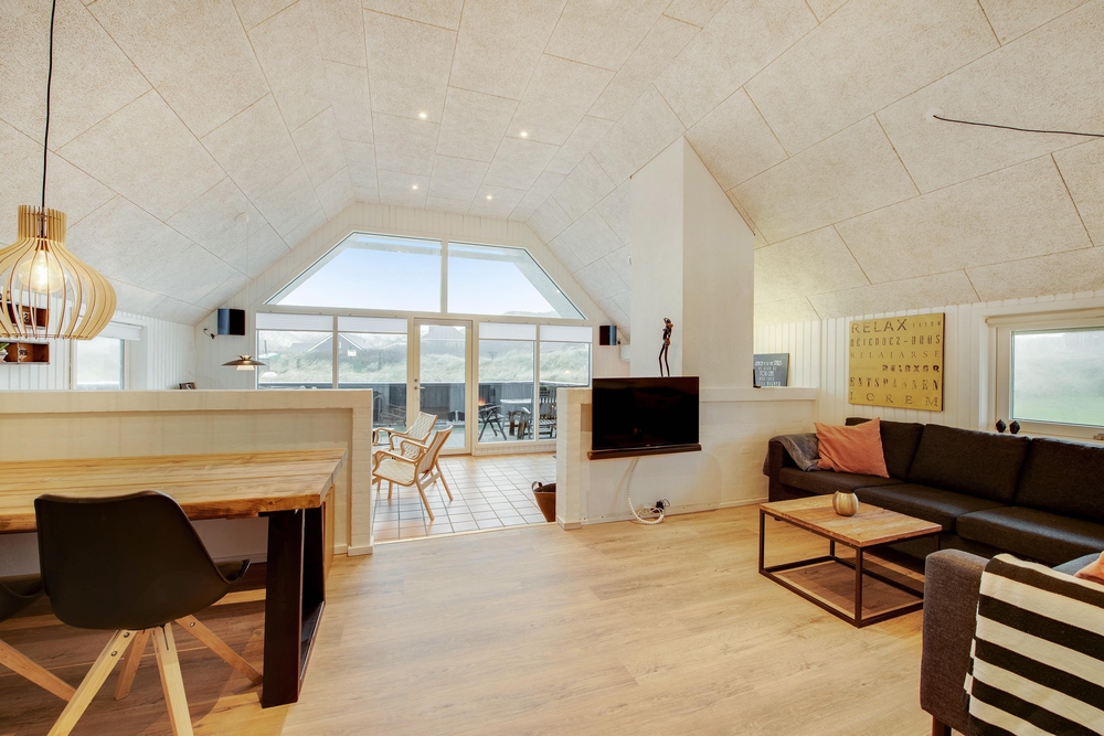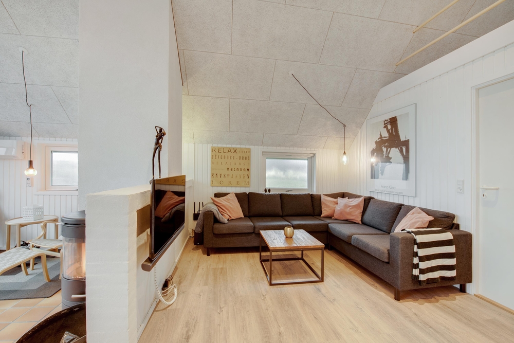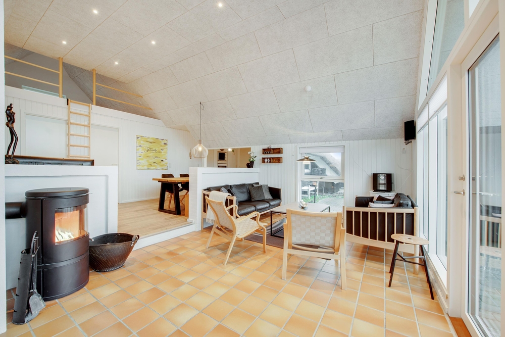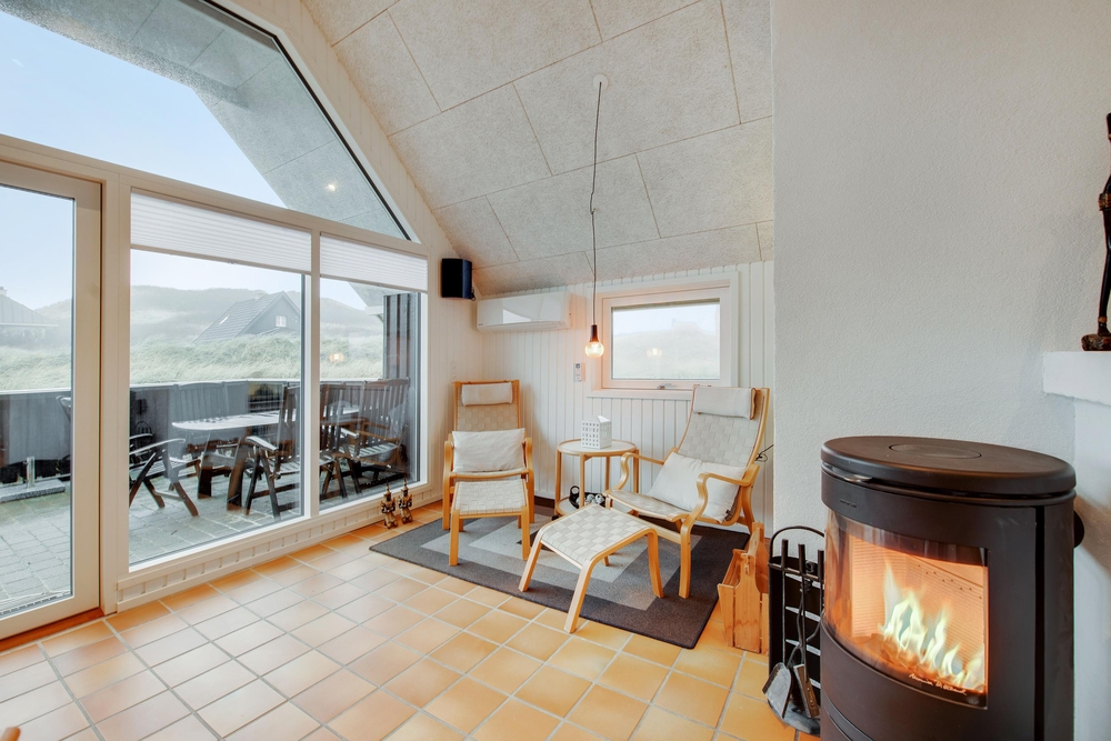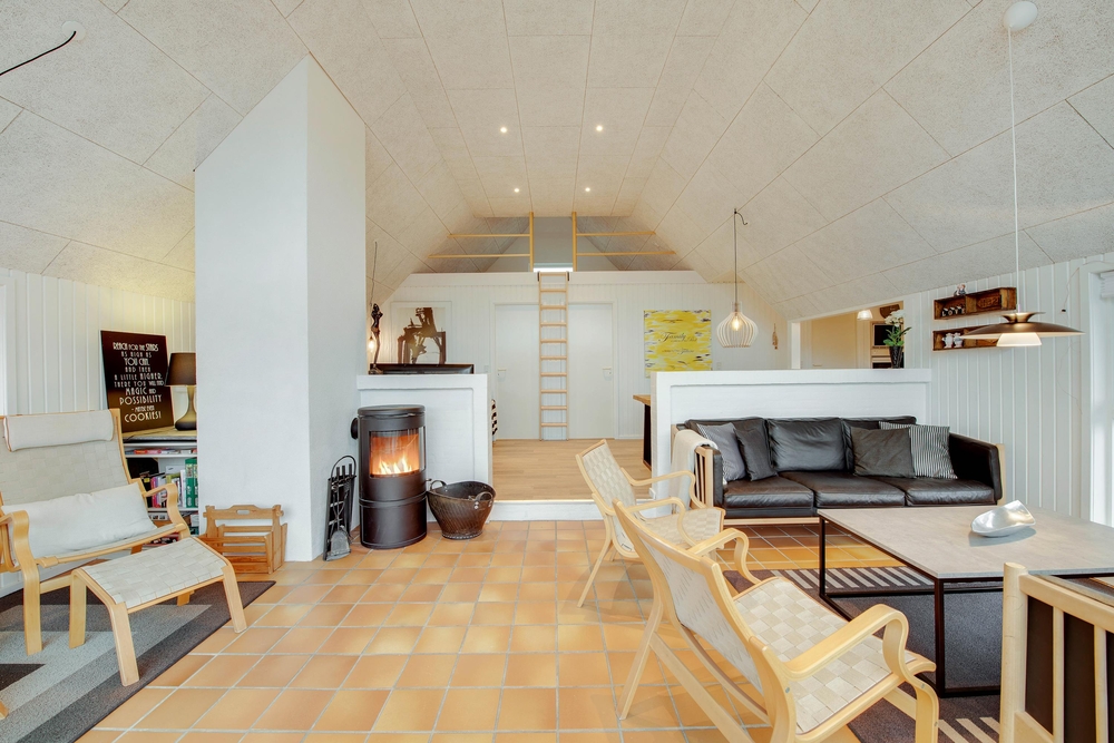 Das Ferienhaus begrüßt euch mit einem offenen Wohnkonzept. Ob beim Kochen oder beim Pläneschmieden am Esstisch, keiner wird ausgeschlossen. Hier herrscht eine gute Atmosphäre, wo ihr schöne Ferien verbringen könnt. Wenn ihr gemeinsam am Abend gekocht habt, übernimmt die Spülmaschine den Abwasch und ihr könnt zum gemütlichen Teil des Abends übergehen. In der kühleren Jahreszeit, wenn der Wind ums Haus tost, dann macht den Holzofen an und genießt die kuschelige Ferienhausatmosphäre. Für eine angenehme und konstante Raumtemperatur sorgt die energisparende Luft-zu-Luft Wärmepumpe.