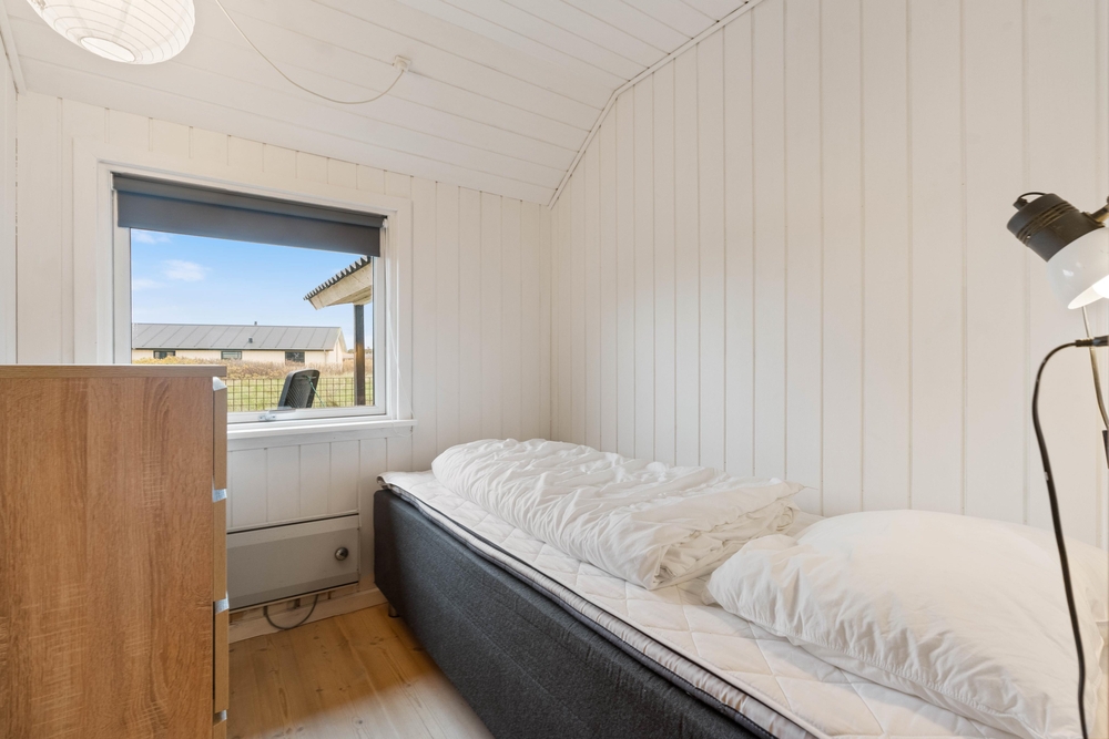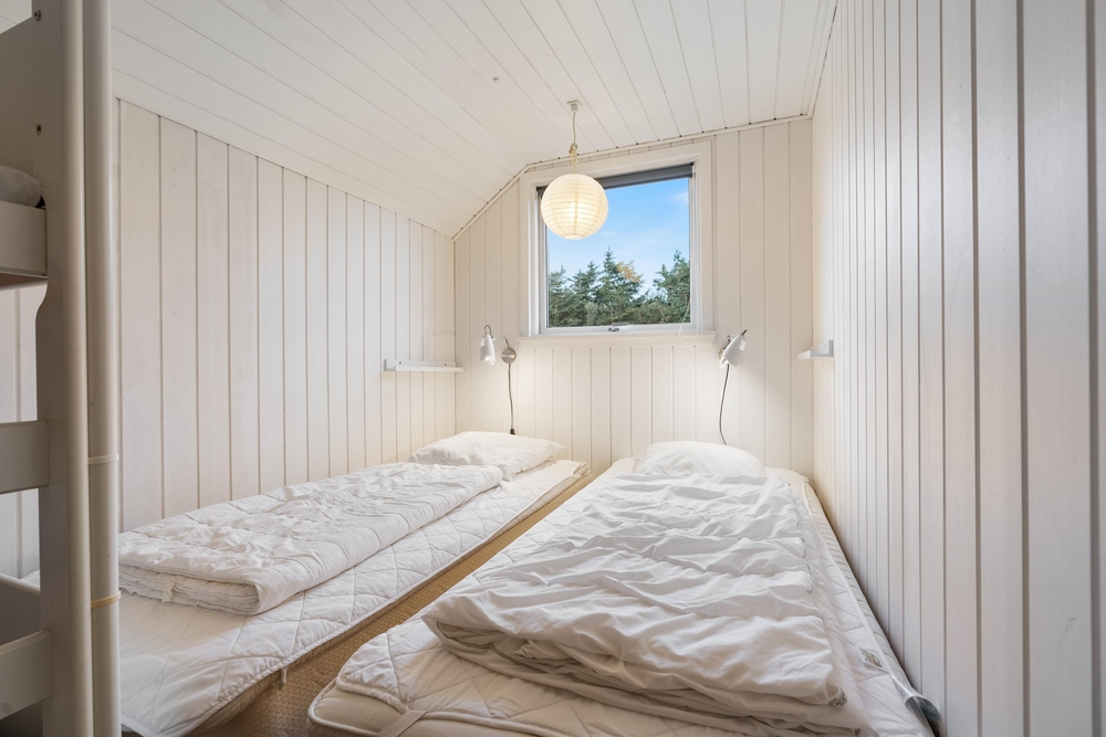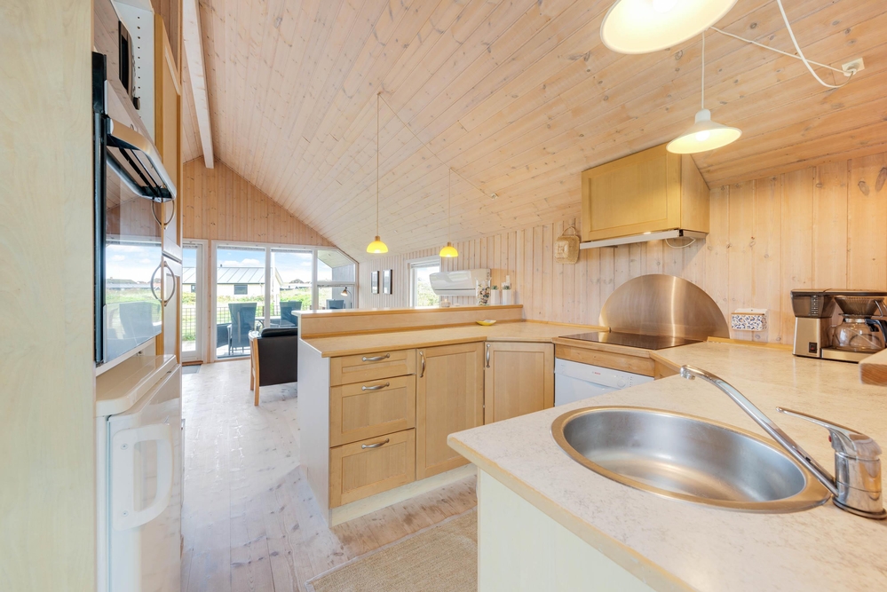 Ein schönes und gemütliches Ferienhaus in Sondervig, gebaut aus Holz, mit offener Decke bis zum First und guter Ausstattung. Es sind 3 Schlafzimmer vorhanden, von eines mit einem Einzelbett ausgestattet ist, während die anderen beiden Schlafzimmer über zwei Einzelbetten verfügen. Als besonderes extra ist eines der beiden Schlafzimmer mit den 2 Einzelbetten zusätzlich mit einem Etagenbett ausgestattet.