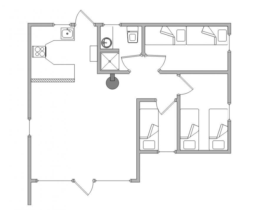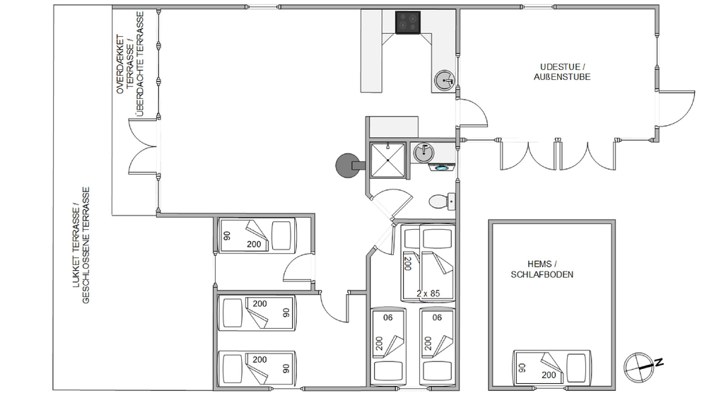 Auf dem Hängeboden befindet sich ebenfalls ein Schlafplatz. Das Badezimmer ist mit Fußbodenheizung, Dusche und Waschmaschine ausgestattet. In der Küche findet Ihr einen Geschirrspüler und eine Mikrowelle, ebenso einen 60 l Gefrierschrank. Die Küche ist in der nordwestlichen Ecke platziert, dort liegt auch der Haupteingang.