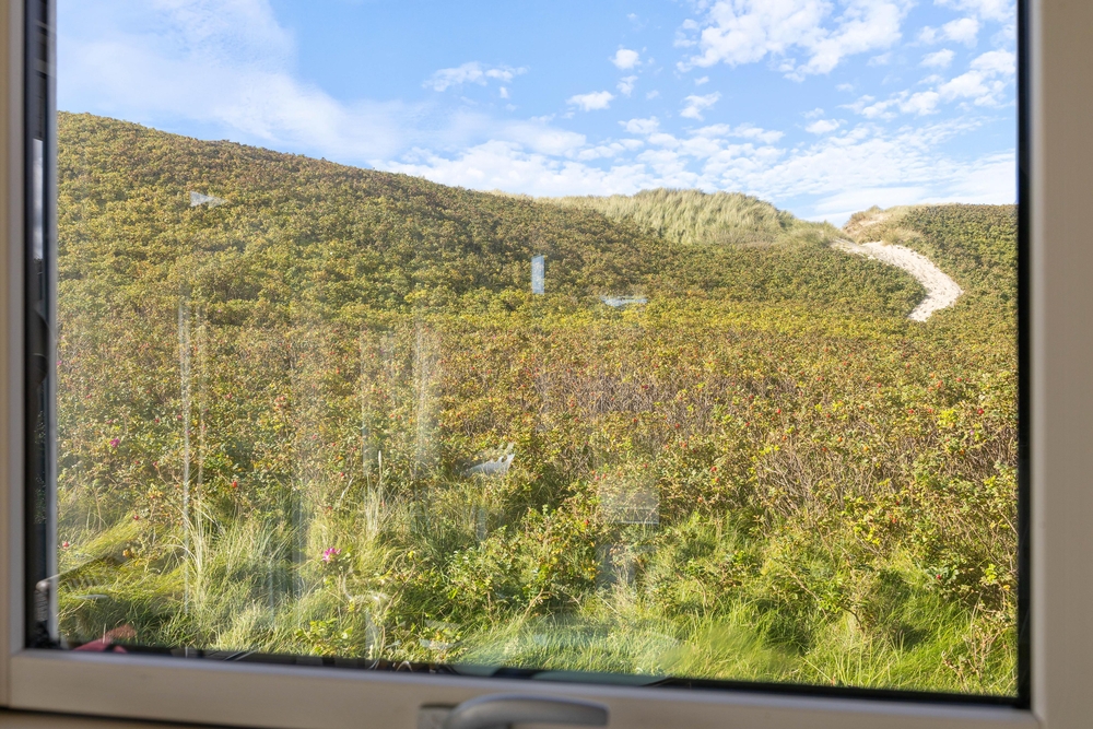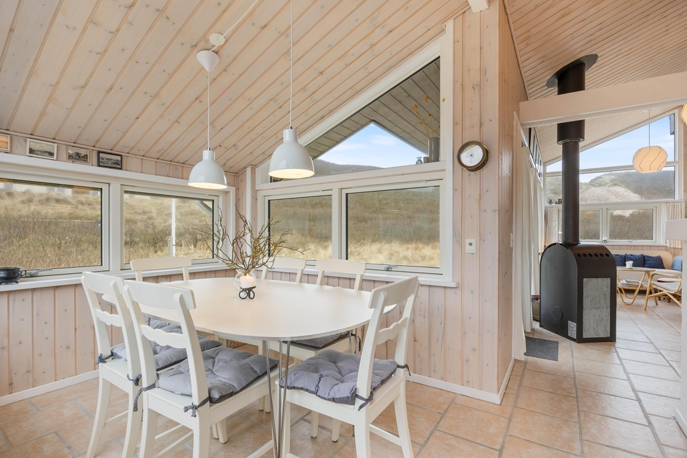 Vom Wohnzimmer aus könnt ihr auch den schönen Panoramablick auf die herrliche Natur rund um das Grundstück genießen. An kühleren Abenden oder nach einem schönen Spaziergang am Strand könnt ihr die Wärme und das Knistern des Holzofens genießen, während ihr euch in ein gutes Buch vertieft. Darüber hinaus ist das Ferienhaus mit einer energiesparenden Luft-Luft-Wärmepumpe ausgestattet, die für ein angenehmes Raumklima sorgt.