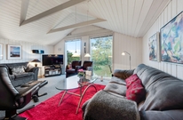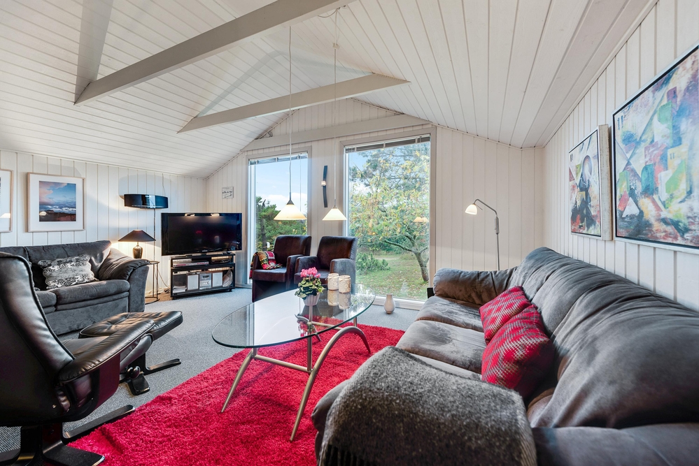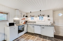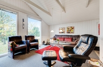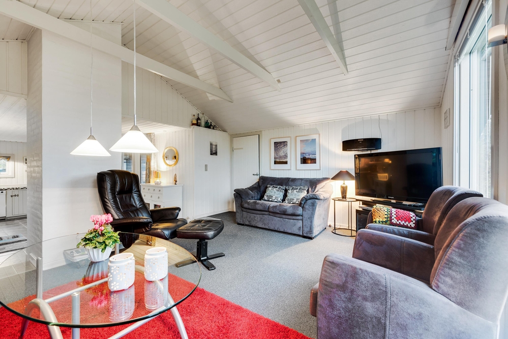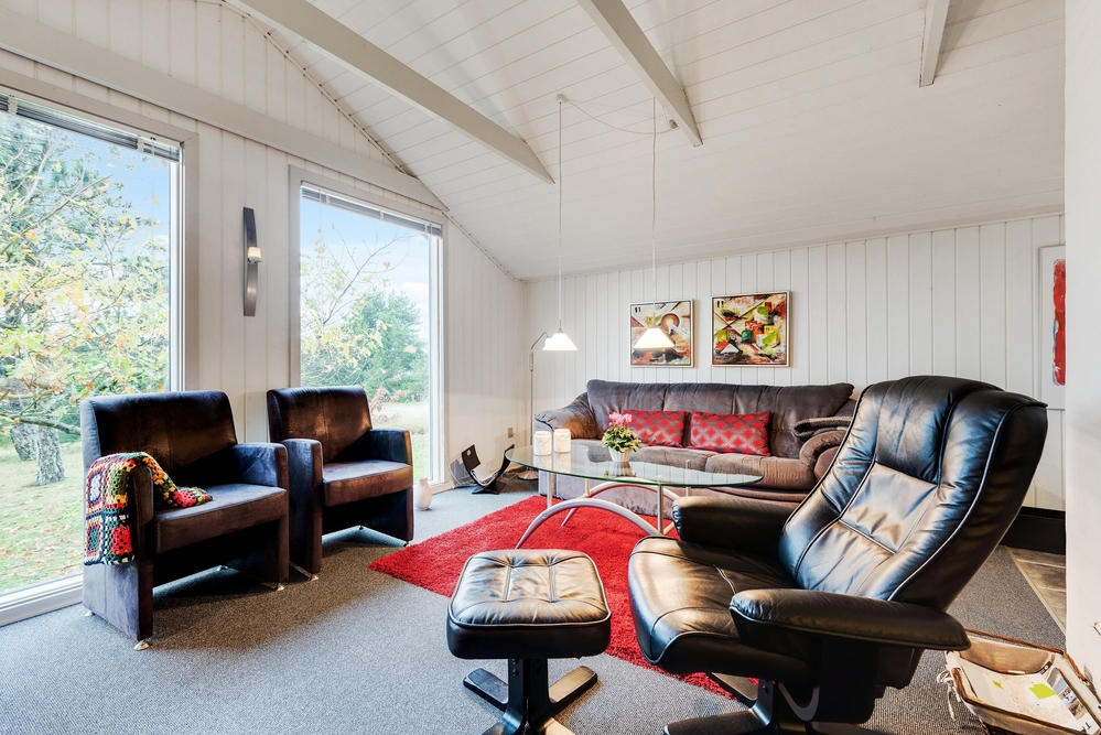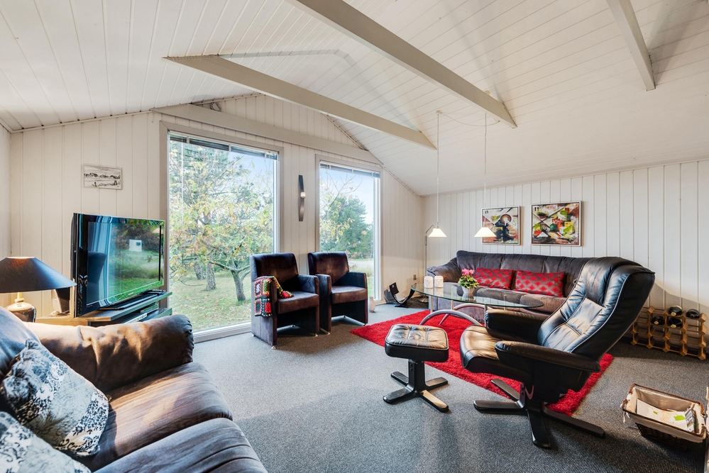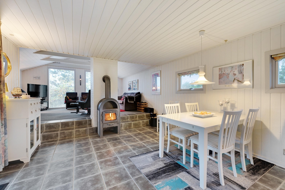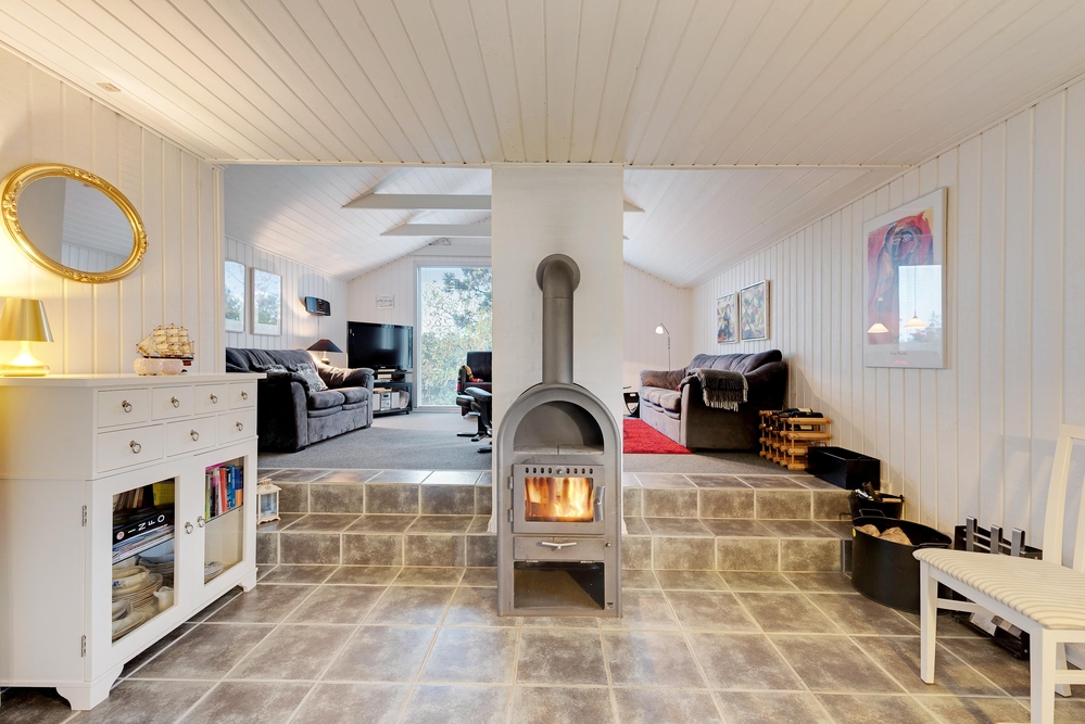 Das Zentrum des Ferienhauses ist die offene Küche und das anliegende Wohnzimmer, welches sich auf zwei Ebenen verteilt. Hier könnt ihr euch im Sessel zurücklehnen und die Aussicht ins Grüne genießen, während im Hintergrund der Kaminofen knistert. In der Fernsehecke erwartet euch neben dem 42? Flachbildfernseher, mit dänischen und deutschen Sendern, auch ein DVD-Spieler und wie im übrigen Haus eine schnelle Internetverbindung.