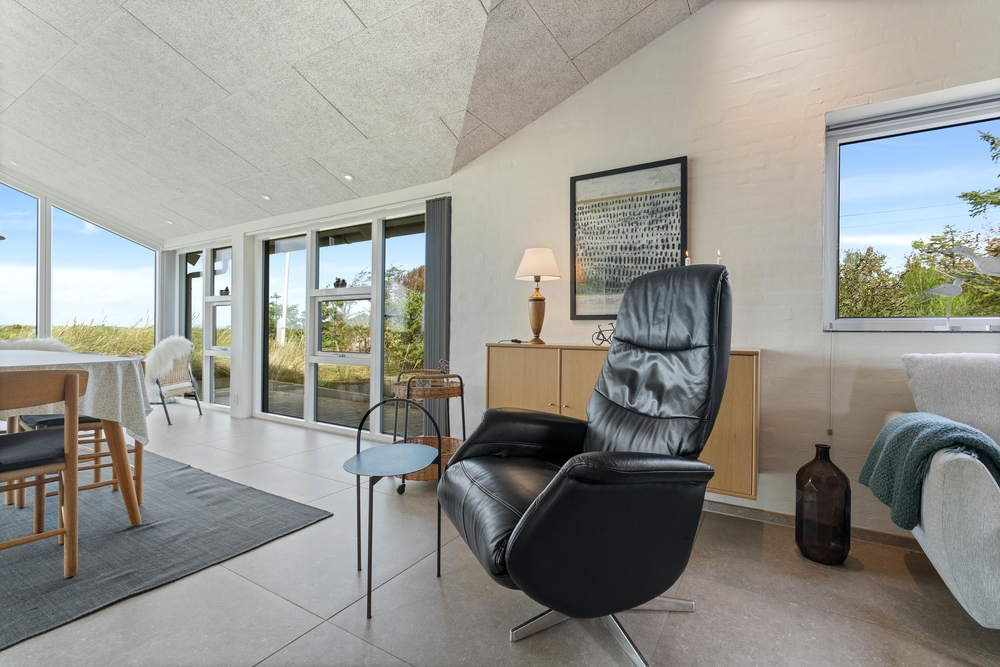 Nehmt im Wohnzimmer entweder auf dem Sofa oder am Esstisch Platz und lasst euren Blick nach Draußen schweifen. Durch die großen Fenster im Wohnbereich könnt ihr auch die Dünen und den Fjord blicken. Wer hier nicht schon entschleunigt und sich entspannt, sollte unbedingt bequeme Schuhe anziehen, und einen langen entspannenden Spaziergang mit dem Hund unternehmen.