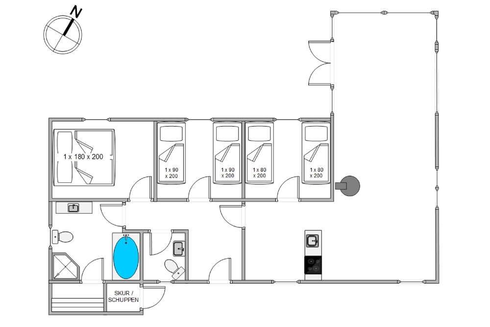 Während die Kinder und der Hund im Garten herumtollen, bereitet ihr vielleicht schon ein leckeres Gericht für die ganze Familie vor. Frischen Fisch bekommt ihr auf jeden Fall im nahe gelegenen Thorsminde. Die Hobbyangler können die eigenen Fische im Außenwaschbecken Säubern.
