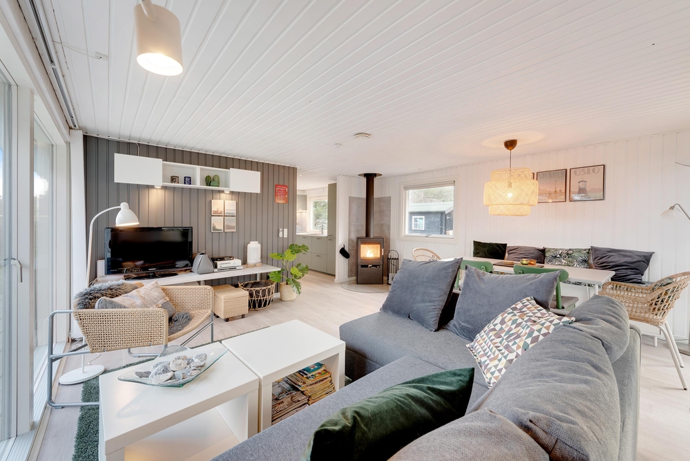 Das kleine Ferienhaus heißt euch in seiner charmanten Umgebung willkommen. Die persönliche und gemütliche Einrichtung, mit vielen kleinen Details sowie die großen Fenster, welche die Sonnenstrahlen hereinlassen und einen schönen Blick auf die grüne Natur ermöglichen, werden euch sicher gefallen.An den grauen und regnerischen Tagen, lauscht ihr dem Knistern des Holzofens, der das Wohnzimmer mit Wärme erfüllt und mit seinen tanzenden Flammen eine besonders gemütliche Urlaubsatmosphäre verbreitet. Die Küche erlaubt passionierten Freizeitköchen, ihrer Phantasie freien Lauf zu lassen. Nach einem leckeren Abendessen rund um den Tisch, könnt ihr auf der Couch relaxen, während die Spülmaschine ihren Dienst tut.