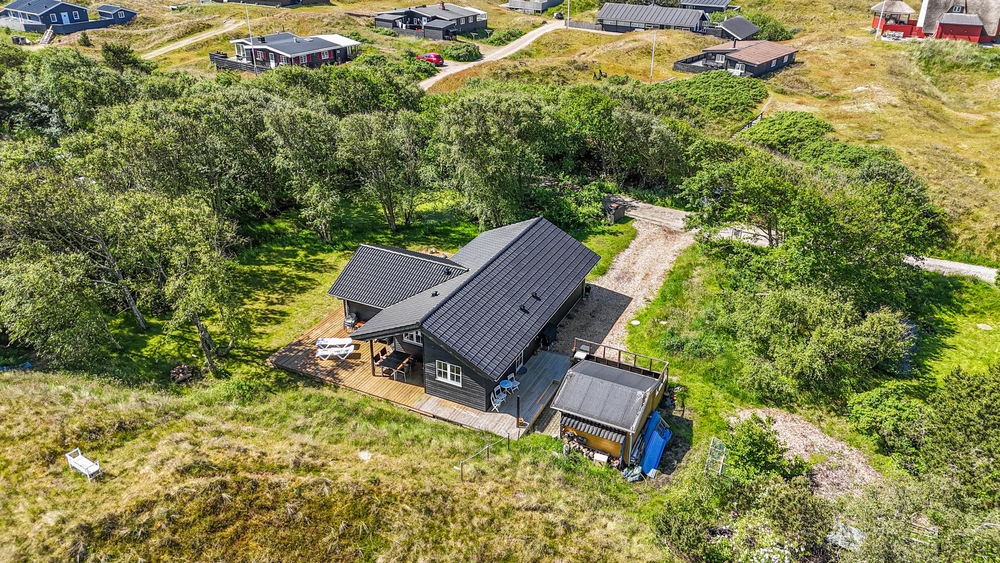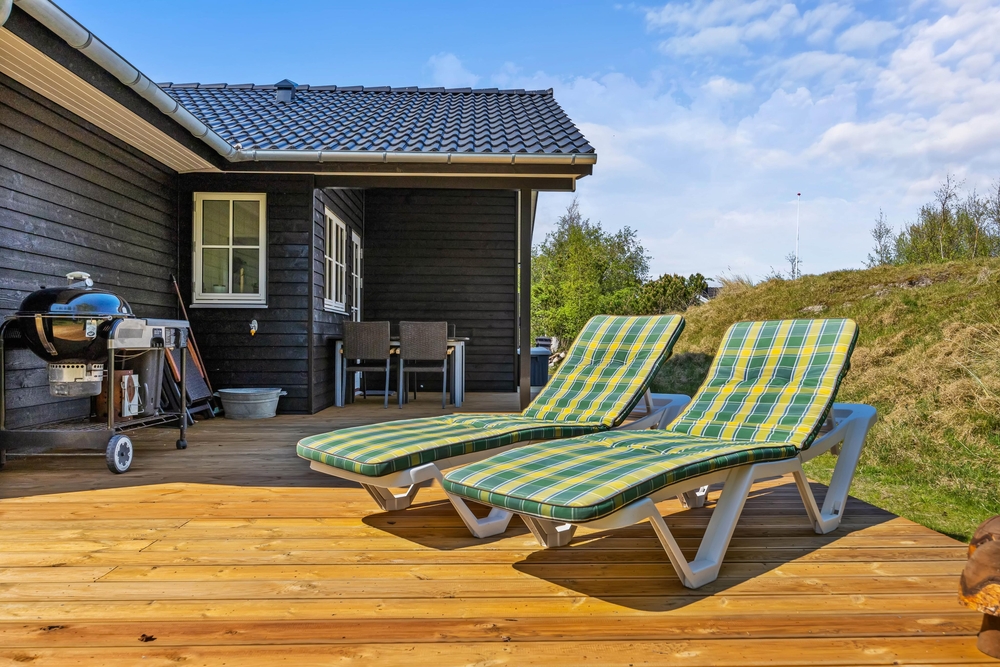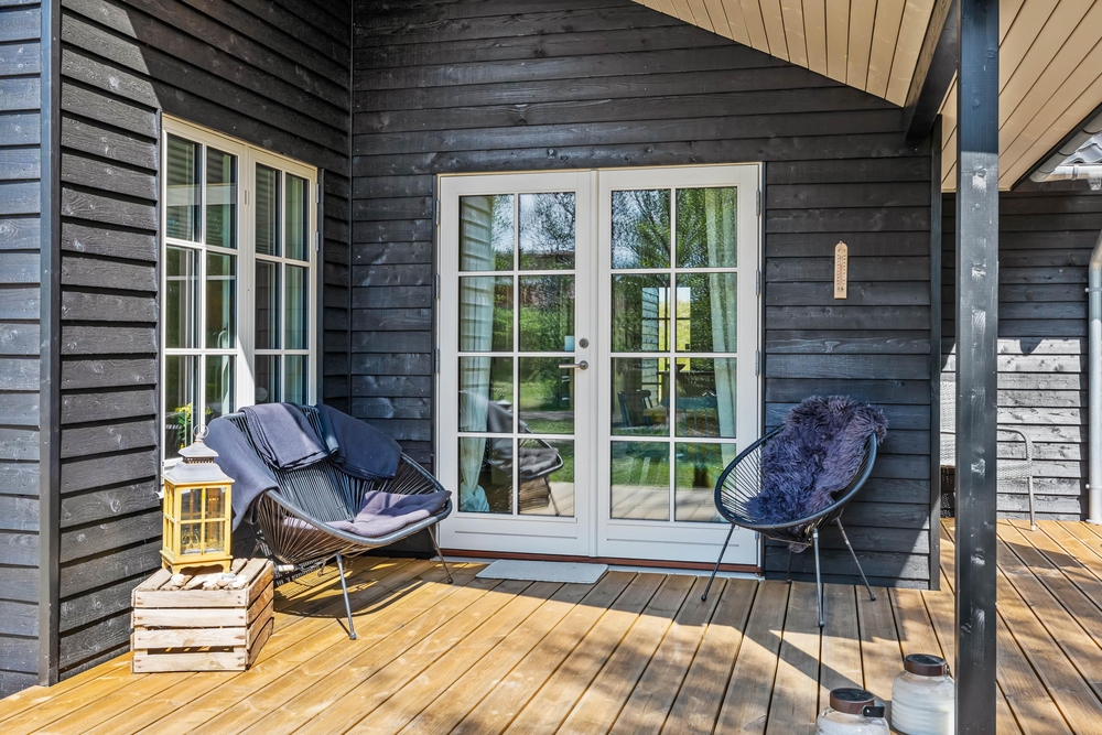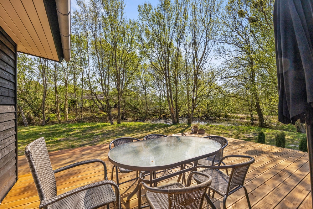 Viele, gemütliche Hygge Ecken findet ihr auch im Außenbereich. Das Ferienhaus ist von einer großen Holzterrasse umgeben, auf der ihr zu allen Tageszeiten die Sonnenstrahlen genießen könnt. Der ein oder andere Waldbewohner wird sich auf dem ruhigen, geschützten Naturgrundstück bestimmt auch mal blicken lassen. Unter dem überdachten Teil von der Terrasse könnt ihr am Abend den Tisch decken und den Ferientag mit einem leckeren Steak vom Grill und einem Glas Wein ausklingen lassen