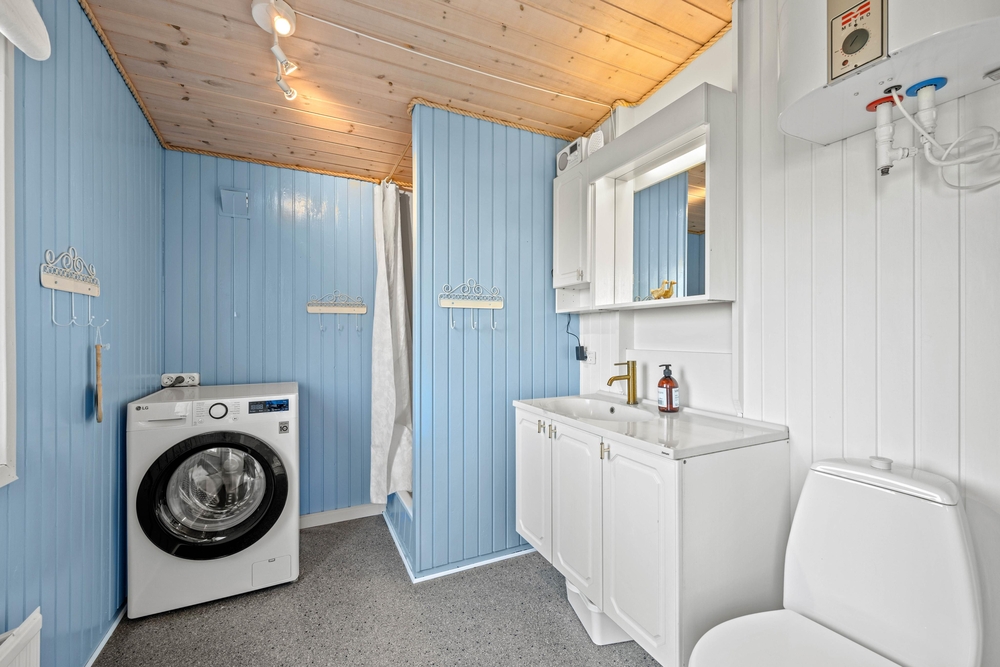 Das gemütliche Badezimmer ist funktionell und hell eingerichtet und mit einer Dusche ausgestattet. Für die Wäsche zwischendurch gibt es im Sommerhaus noch eine Waschmaschine und einen Trockner.