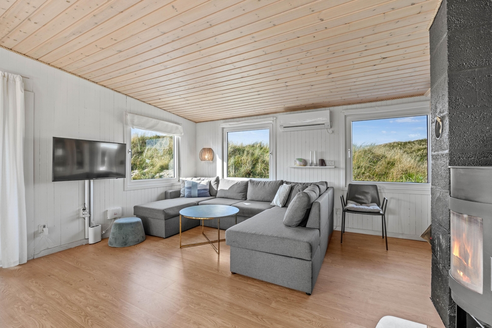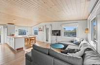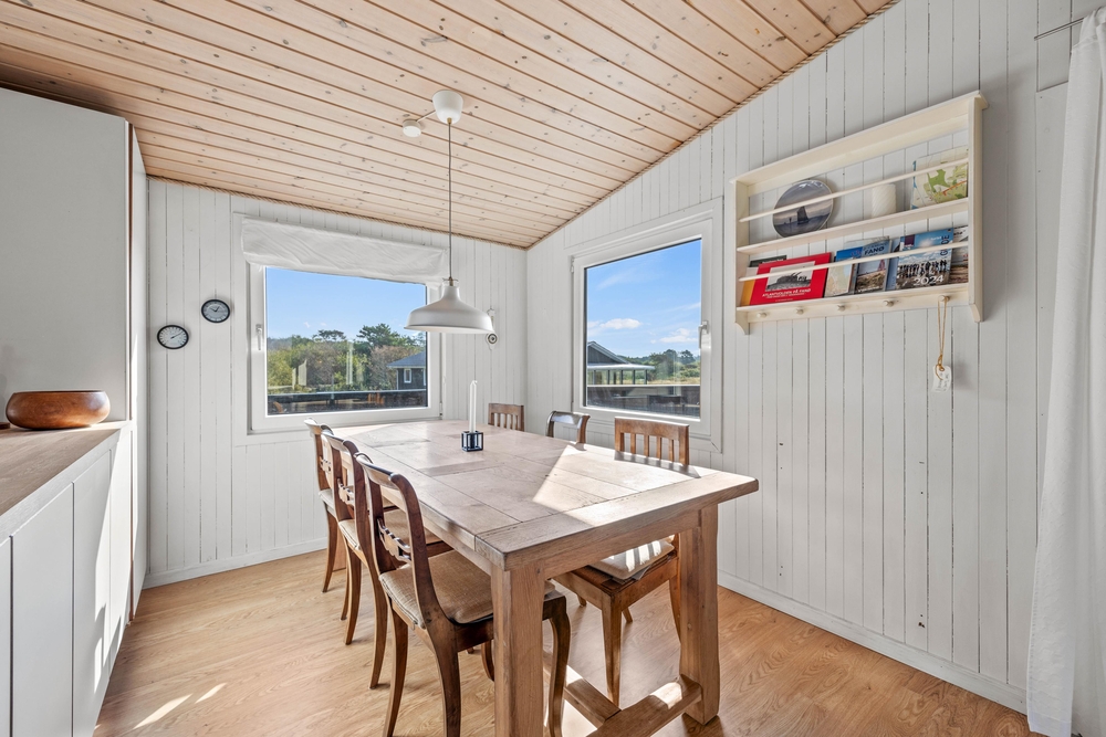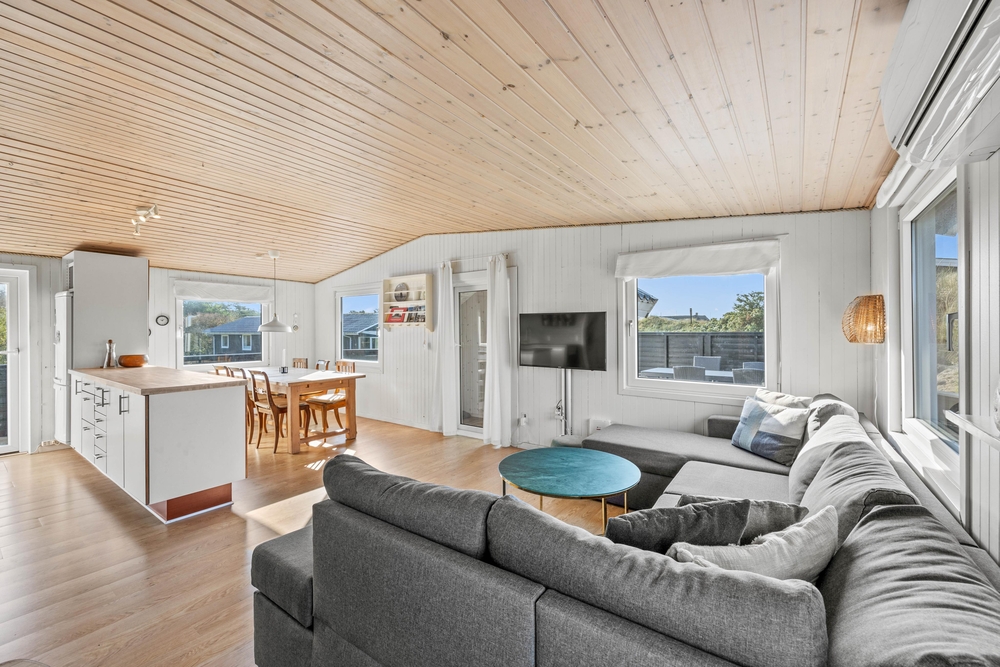 In dem traditionellen Ferienhaus steht der gemütliche und helle Wohnbereich im Fokus. Hier wurden Wohnzimmer, Küche und Esszimmer in einem einzigen Raum kombiniert. Dank der offenen Architektur kann die gesamte Familie den Urlaub gemeinsam genießen. Hier können alle gemeinsam und doch individuell die Abende verbringen. Am Esstisch ist genügend Platz vorhanden, sodass hier gemeinsam ein Brettspiel gespielt werden kann.
