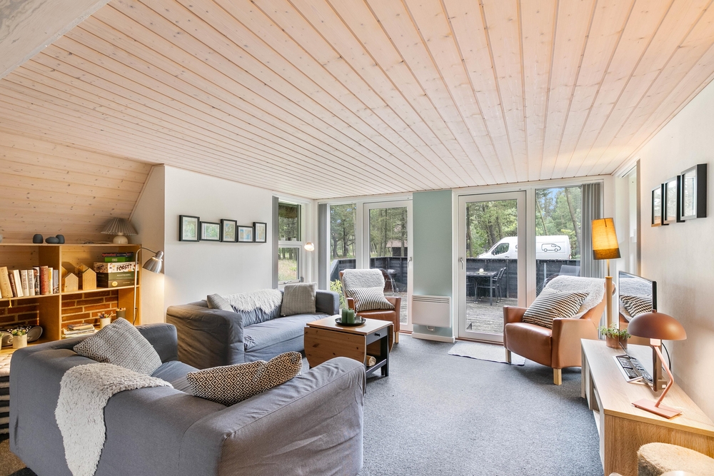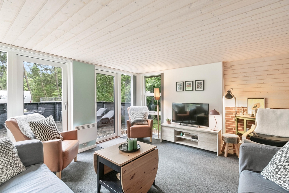 Von der Küche- und dem Essbereich gelangt ihr in das gemütliche Wohnzimmer, in dem ihr auf dem Sofa bei einem guten Film entspannen könnt. Die große Fensterfront lässt hier viel Licht rein und sorgt gleichzeitig für einen schönen Blick auf das Grundstück.