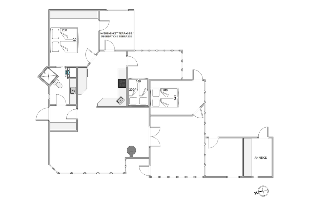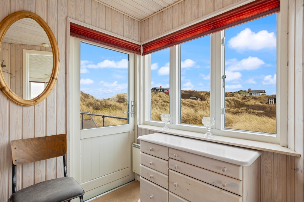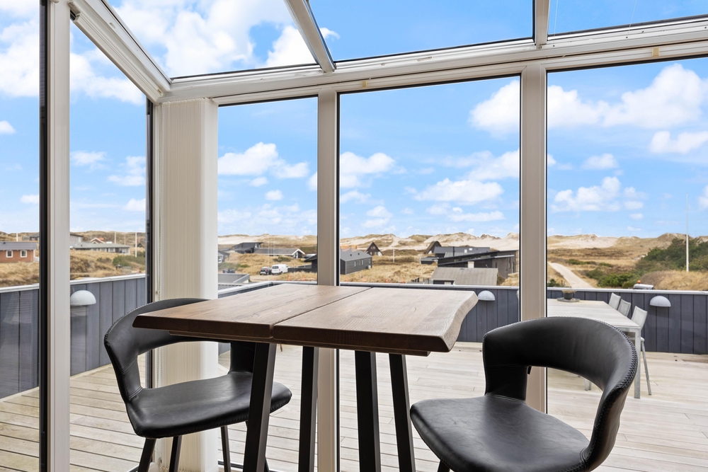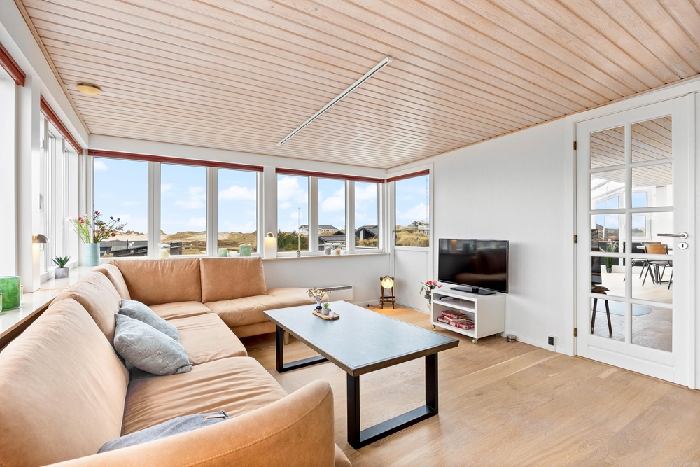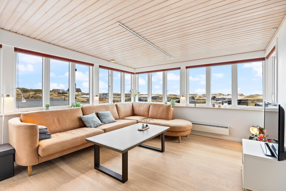 Beim Betreten des Ferienhauses werdet ihr von einer modernen und geschmackvollen, aber dennoch gemütlichen Einrichtung begrüßt, welches euch durch die vielen Fenster sehr viel Tageslicht bietet. Der große Wohnraum, der Küche, Wohnzimmer und Essbereich miteinander verbindet, ist der perfekte Platz, um gemeinsam zu kochen, Zeit zu verbringen, die kommenden Urlaubstage zu planen und Spiele zu spielen. Für diejenigen, die gerne ein Buch lesen möchten, findet sich auch immer ein ruhiges Plätzchen. Die große Fensterfront im Wohnraum bietet euch einen tollen Panoramablick über das Feriengebiet von Søndervig. Für die Extraportion Gemütlichkeit und die typische Ferienhausatmosphäre sorgt der Kamin im Wohnraum.