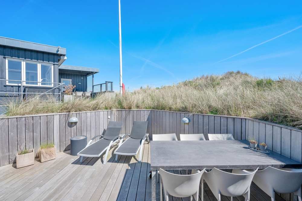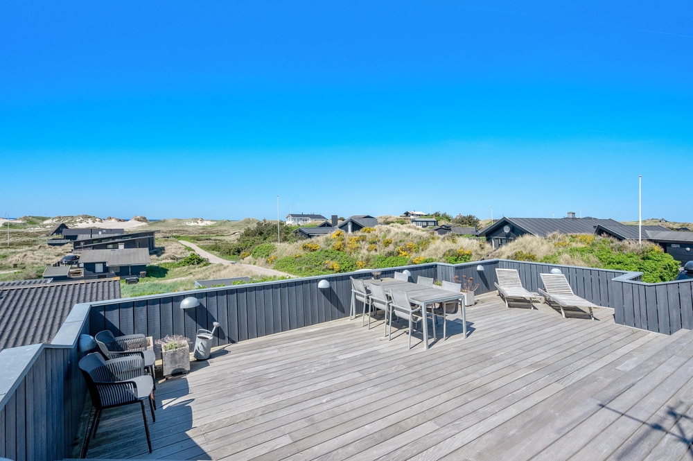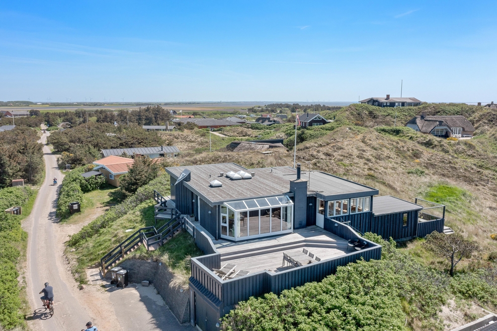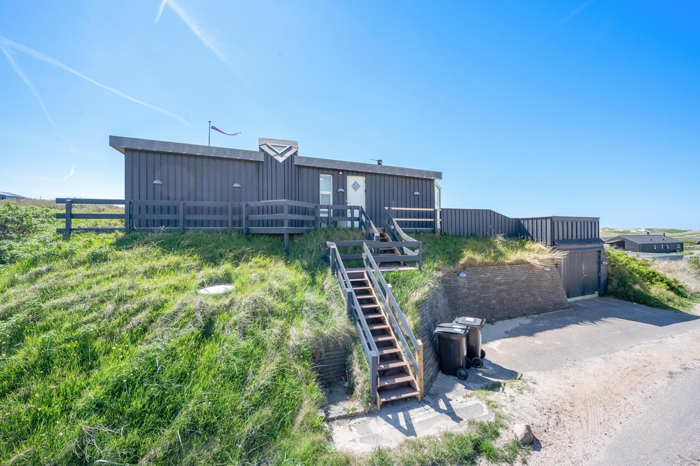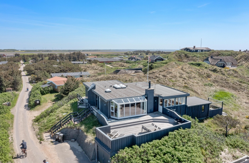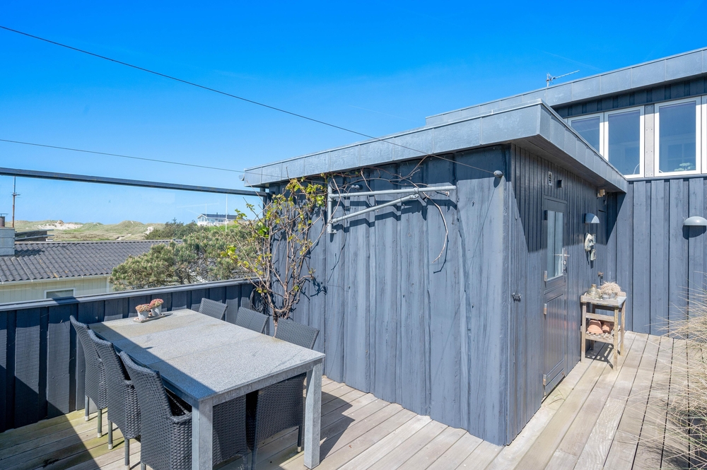 Das Ferienhaus im Harbo Stages Vej 37 in Søndervig steht auf einem ca. 1275 m2 großen Dünen- und Naturgrundstück, leicht erhöht, und hat verschiedene Terrassen, die zum Teil überdacht, offen und abgeschirmt sind, sodass jeder seinen Lieblingsplatz finden wird. Das Sonnendeck über der Garage ist besonders schön und lädt zu entspannten Sonnenbädern ein. Da das Ferienhaus etwas erhöht ist, habt ihr von der Terrasse aus einen tollen Panoramablick über das Feriengebiet in Søndervig. Unterhalb des Ferienhauses befindet sich die Garage.