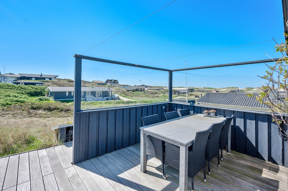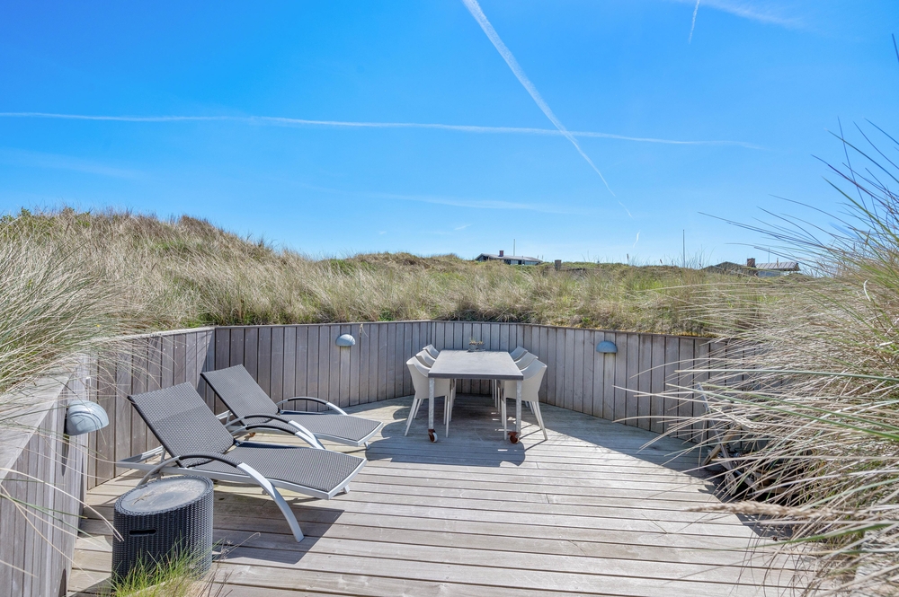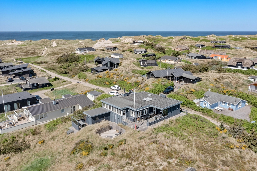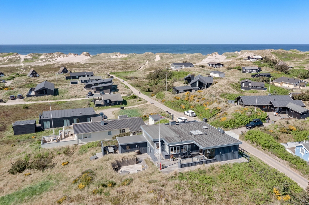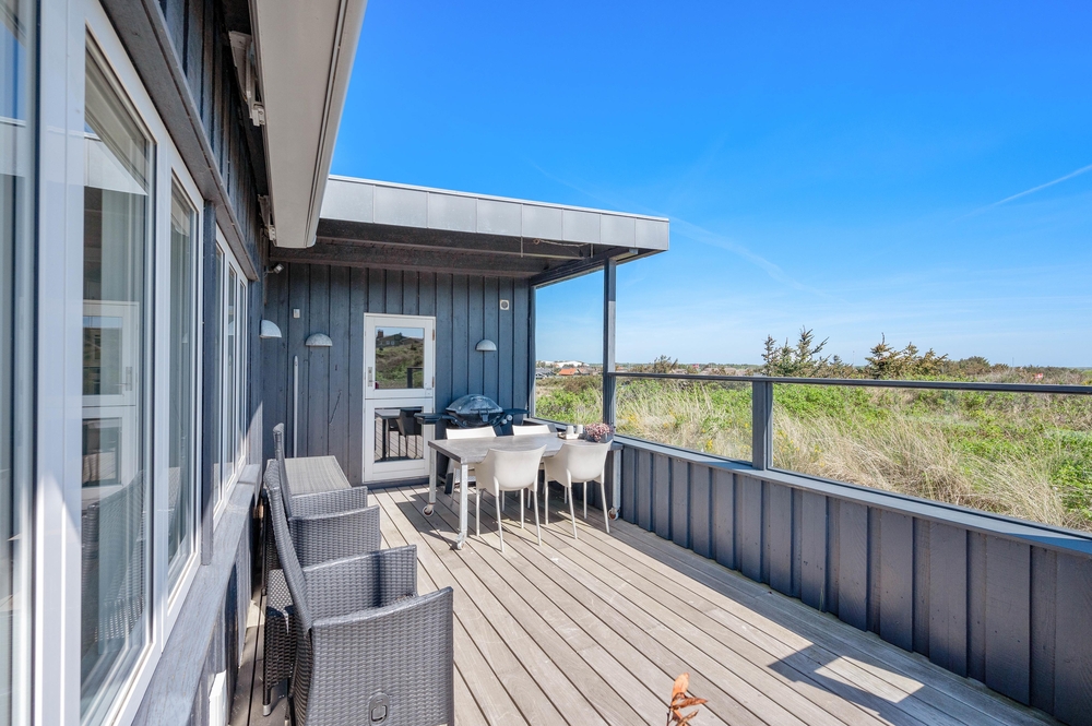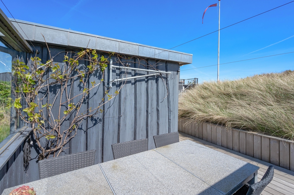 Das Ferienhaus im Harbo Stages Vej 37 in Søndervig steht auf einem ca. 1275 m2 großen Dünen- und Naturgrundstück, leicht erhöht, und hat verschiedene Terrassen, die zum Teil überdacht, offen und abgeschirmt sind, sodass jeder seinen Lieblingsplatz finden wird. Das Sonnendeck über der Garage ist besonders schön und lädt zu entspannten Sonnenbädern ein. Da das Ferienhaus etwas erhöht ist, habt ihr von der Terrasse aus einen tollen Panoramablick über das Feriengebiet in Søndervig. Unterhalb des Ferienhauses befindet sich die Garage.
