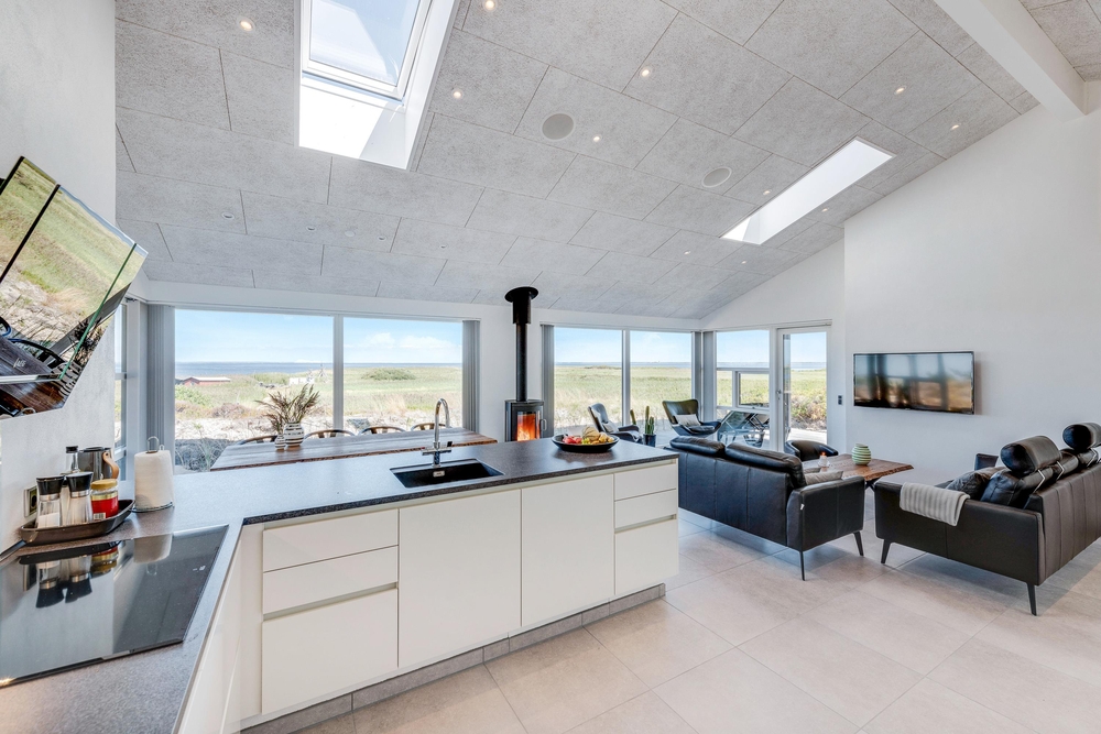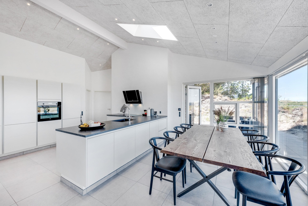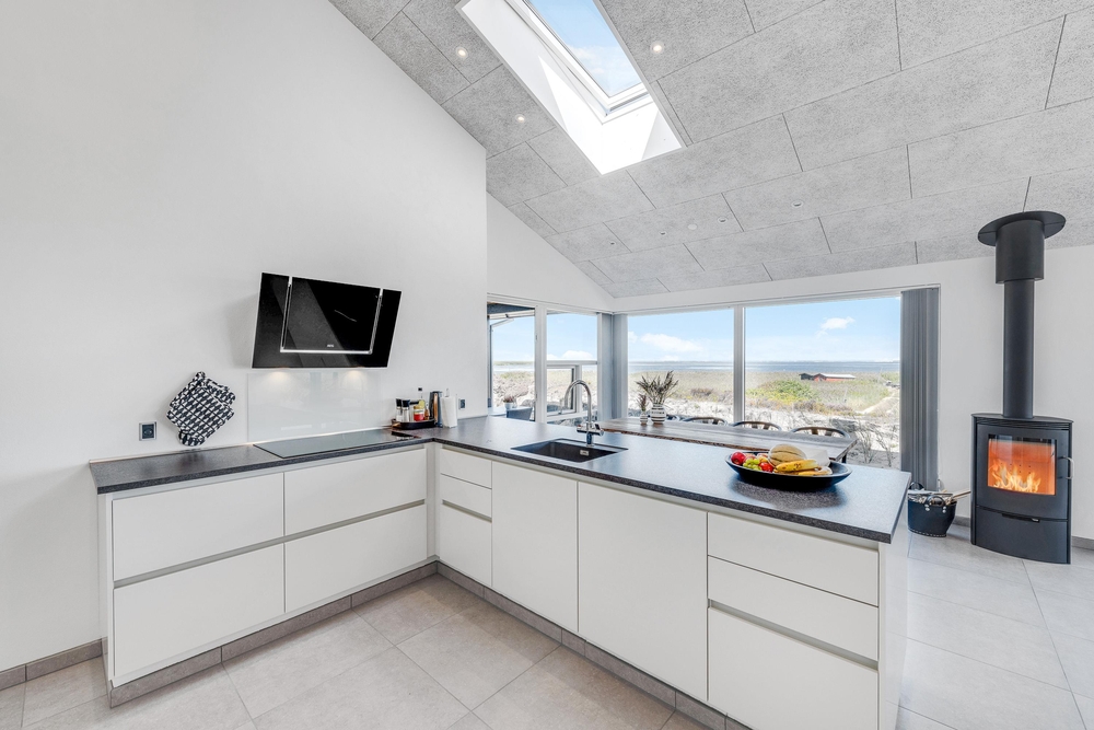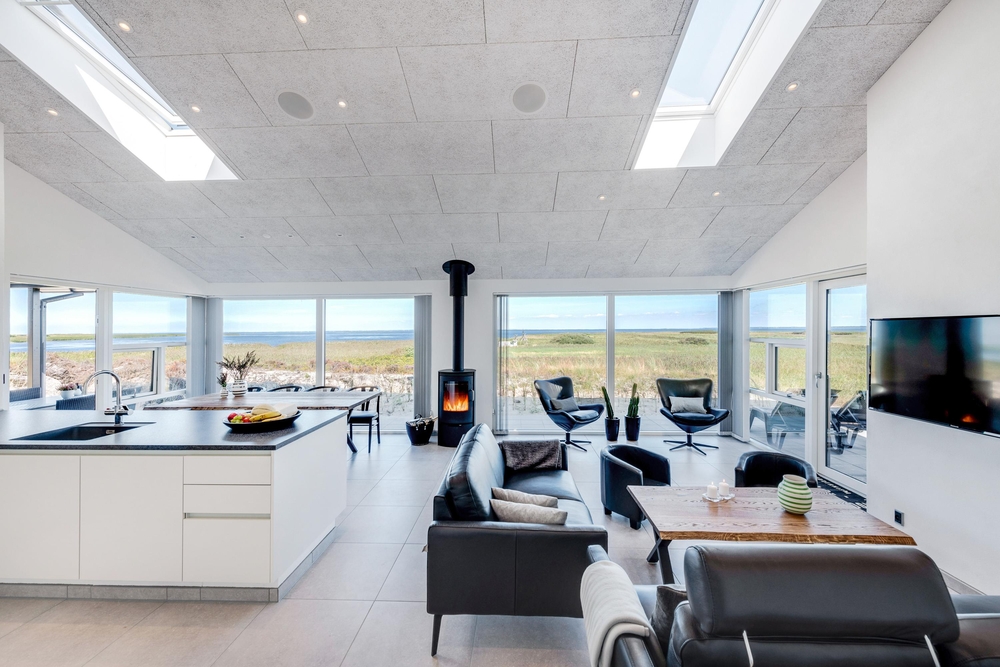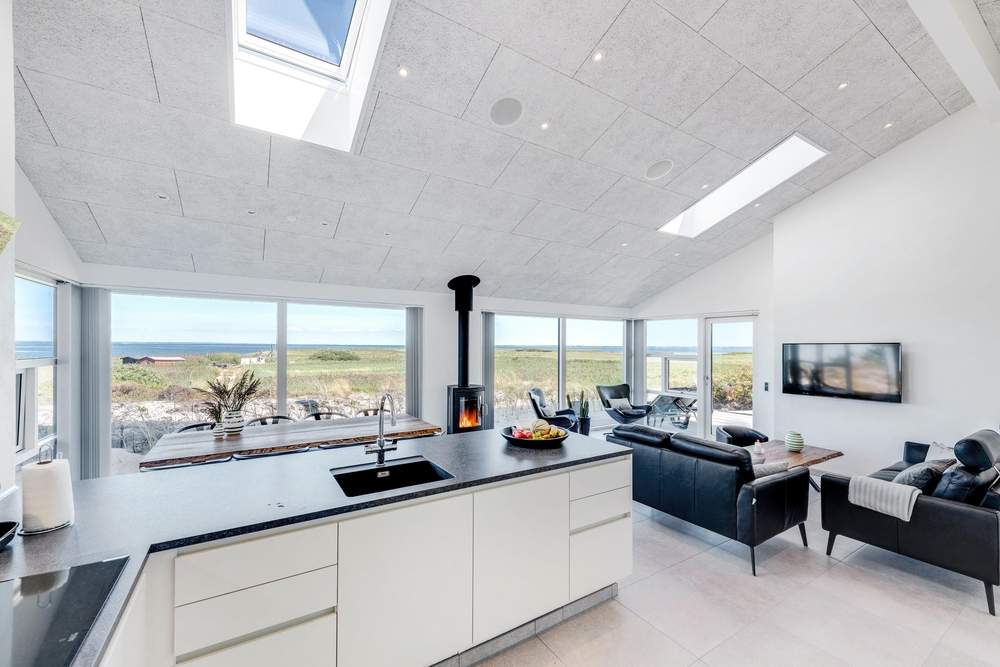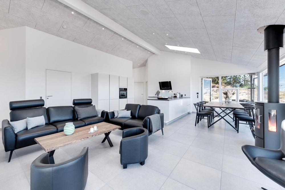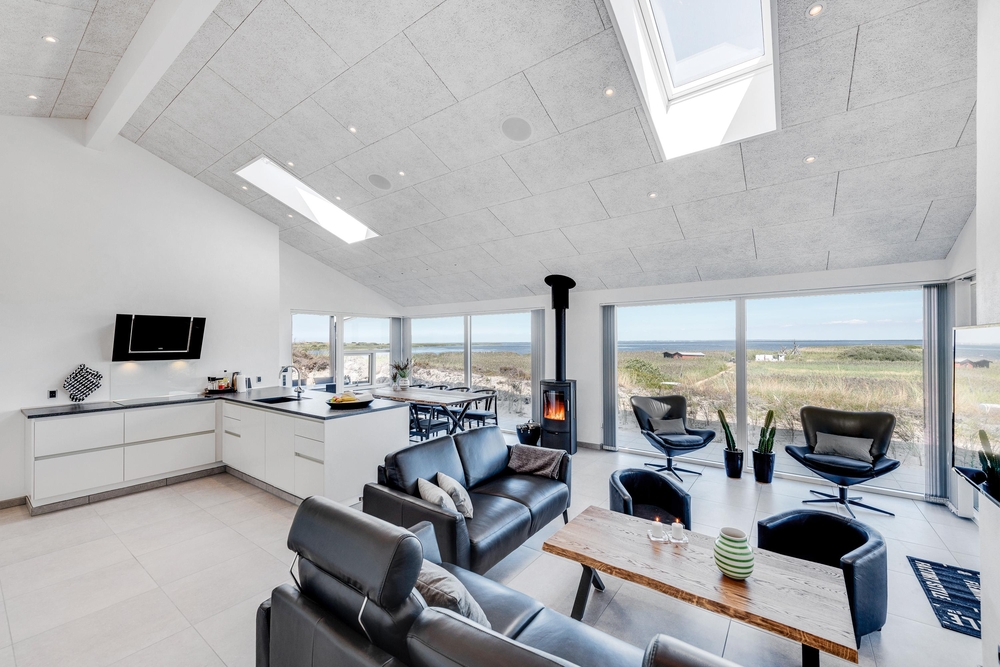 Der lichtdurchflutete Wohnraum vereint die Küche, das Esszimmer und das Wohnzimmer. Der herrliche Raum ist offen und geräumig mit einer fantastischen Panoramaaussicht auf den Ringkøbing Fjord und die umliegende Natur. Die großen Fensterfronten lassen sehr viel Licht rein, was für eine sehr angenehme Atmosphäre sorgt.