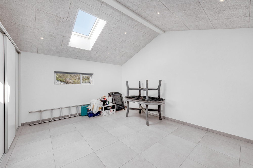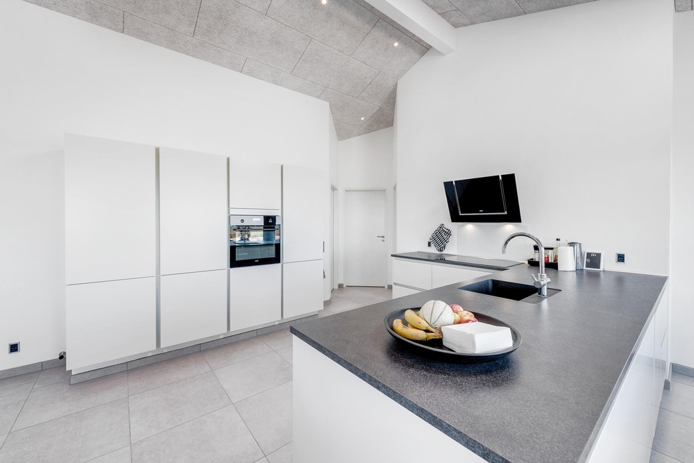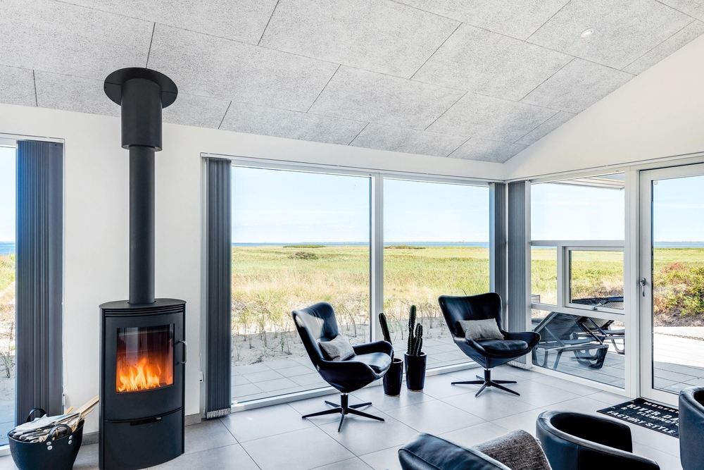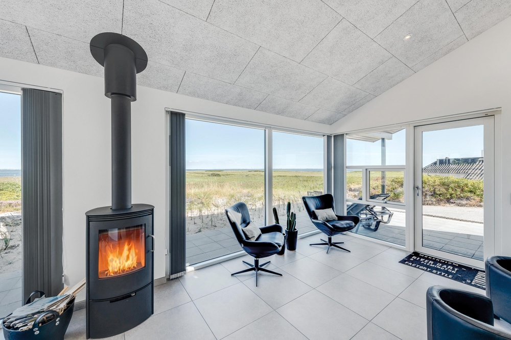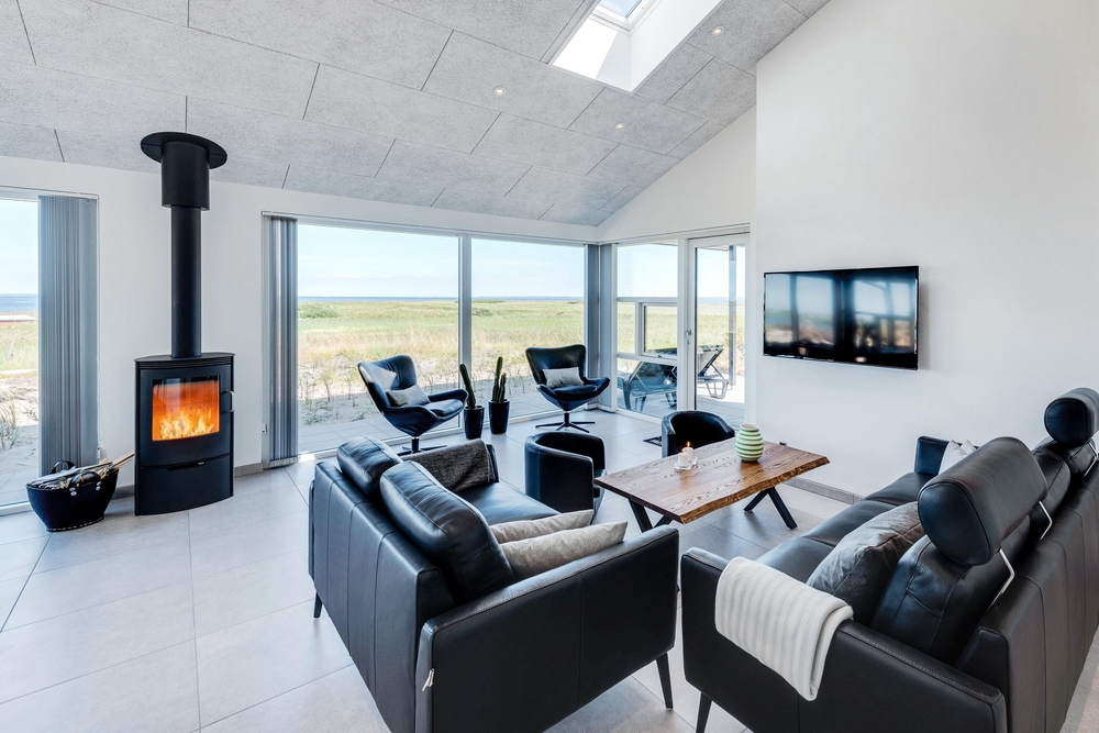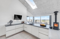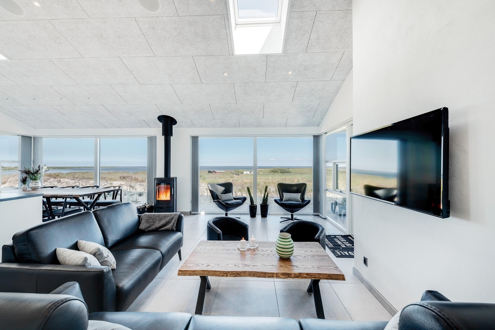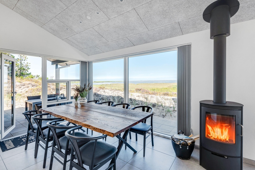 Der lichtdurchflutete Wohnraum vereint die Küche, das Esszimmer und das Wohnzimmer. Der herrliche Raum ist offen und geräumig mit einer fantastischen Panoramaaussicht auf den Ringkøbing Fjord und die umliegende Natur. Die großen Fensterfronten lassen sehr viel Licht rein, was für eine sehr angenehme Atmosphäre sorgt.
