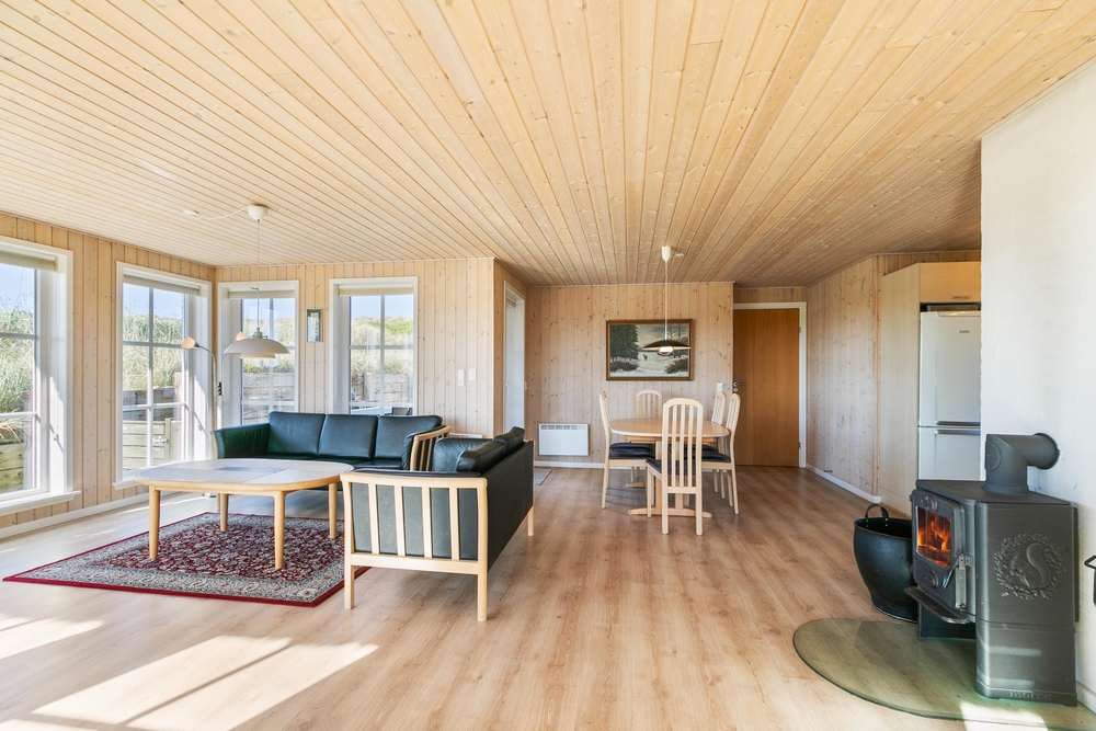 Das Herzstück dieses charmanten Ferienhauses bildet der große und offen gestaltete Wohnbereich. Hier wurde viel helles Holz verbaut und durch die zahlreichen Fenster kommt reichlich Licht herein. Hier könnt ihr es euch mit der ganzen Familie auf dem Sofa bequem machen und einen Film schauen. Vorm knisternden Kaminfeuer lässt es sich herrlich entspannen, z. B. mit einem Glas Wein und einem guten Buch.