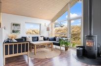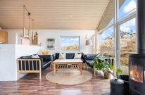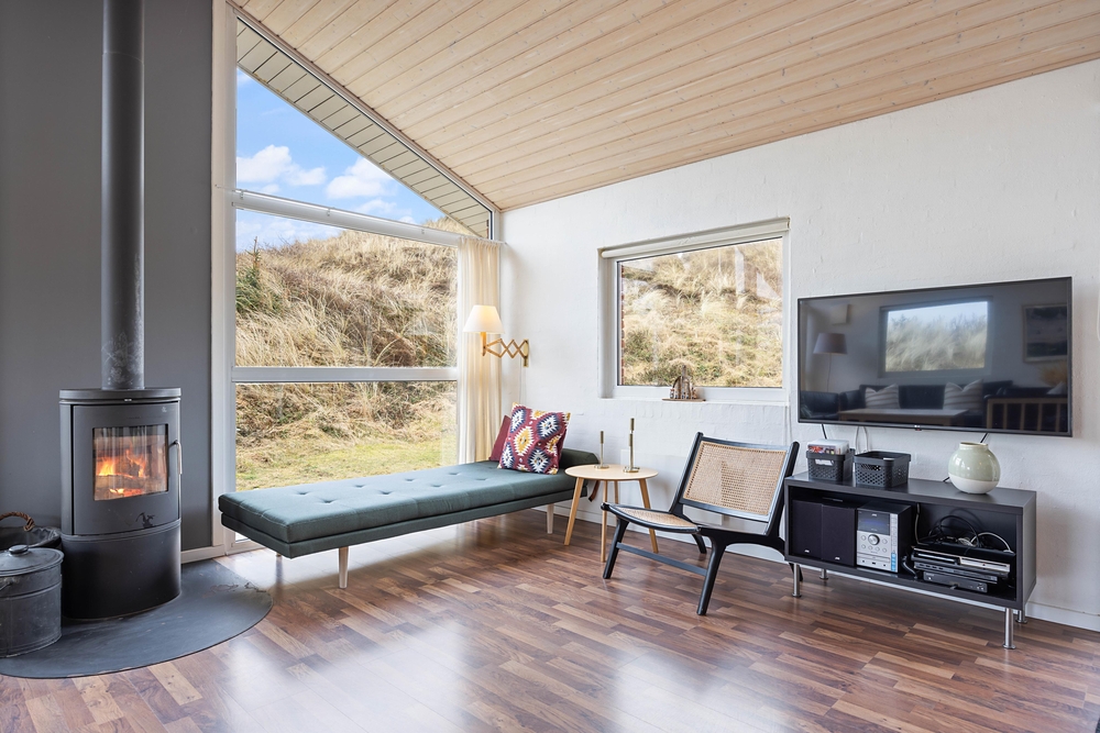 Der Wohnbereich ist offen gestaltet und durch die großen Fenster kommt viel natürliches Tageslicht in das Ferienhaus hinein. Neben dem Kamin steht ein Tagesbett für euch bereit ? macht es euch hier z.B mit einem Buch in der Hand gemütlich, lauscht dem Knistern des Kamins und genießt die Aussicht.