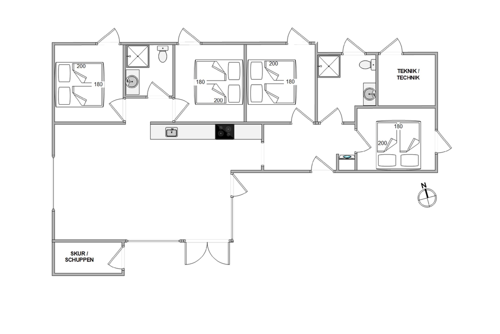 Die Schlafzimmer sind in zwei Abteilungen, jeweils mit zwei Schlafzimmern und einem Badezimmer, aufgeteilt ? ideal, wenn ihr mit zwei Familien anreisen möchtet. Eins der Badezimmer ist auch leicht mit einem Rollstuhl zugänglich. Im Wohnbereich gibt es einen Kamin, der abends für eine gemütliche Stimmung sorgt.