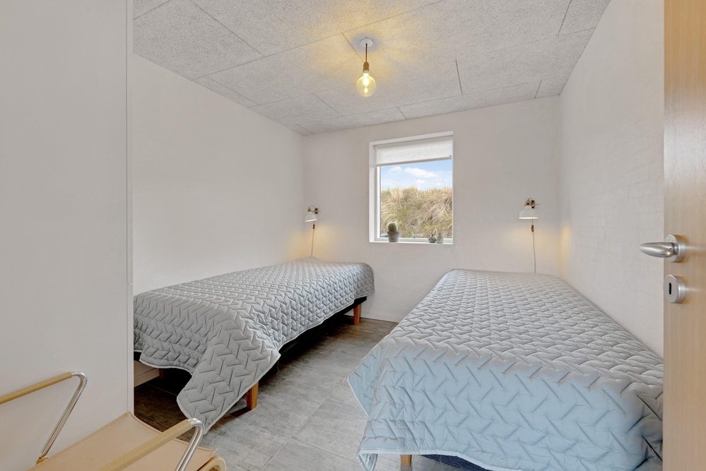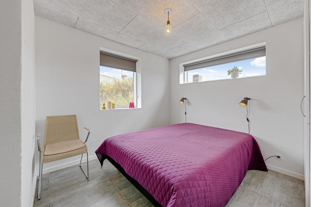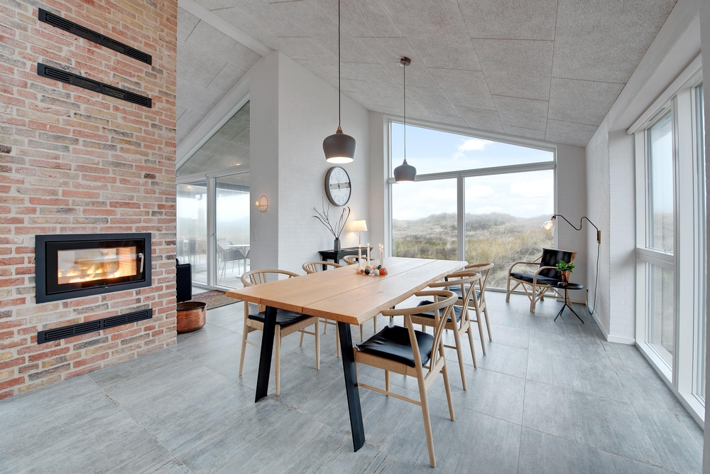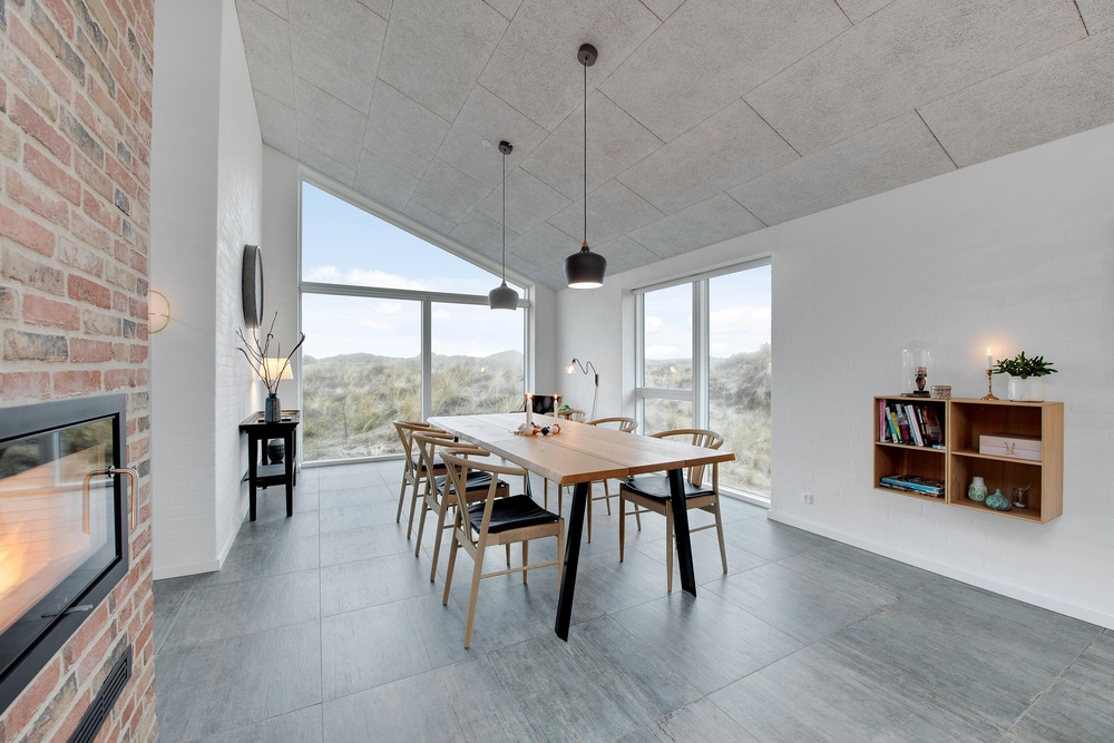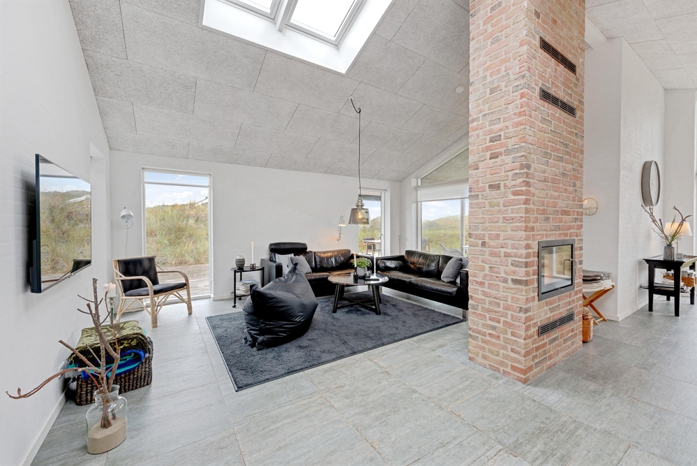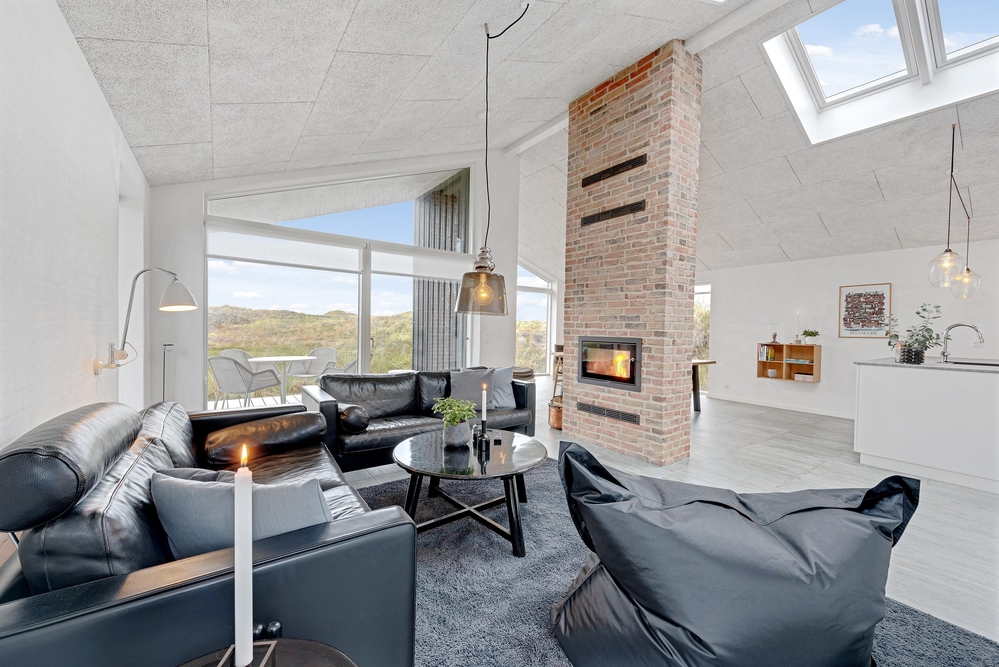 Die klaren geraden Linien, die hellen Farben und das moderne Design ziehen sich durch das ganze Haus. Dennoch sind auch Gemütlichkeit und Geselligkeit ein wichtiger Faktor. Unterstützt werden diese Aspekte durch den mitten im Raum befindlichen gemauerten Schornstein, der zu beiden Seiten einen Kamin aufweist. Das knisternde Feuer und das flackernde Licht, verbunden mit der wohltuenden Wärme, sorgen für eine angenehme Ferienstimmung. Macht es euch bequem und geniesst die herrliche Aussicht auf die umliegende Dünenlandschaft.