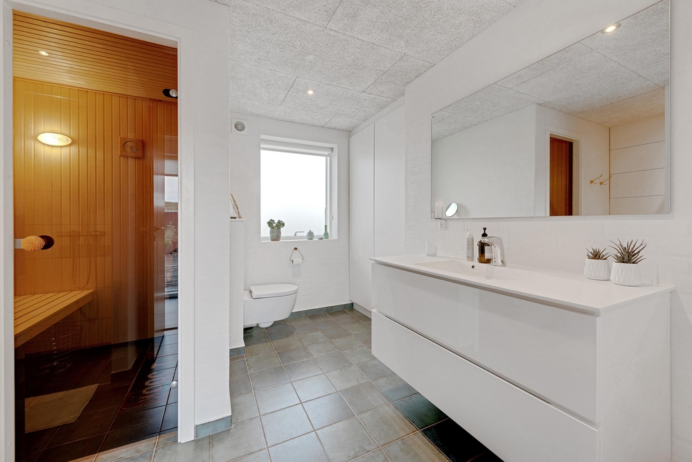 Das, wie auch der Rest des Hauses, mit Fussbodenheizung ausgestattete Badezimmer, verfügt über die hauseigene Sauna, in der ihr euch nach einem langen Tag an der frischen Nordseeluft prima entspannen könnt.