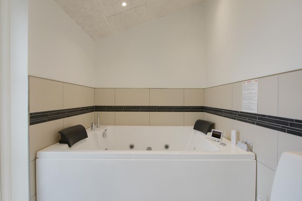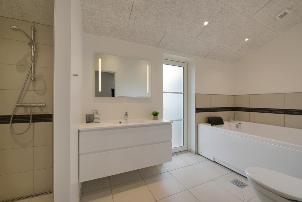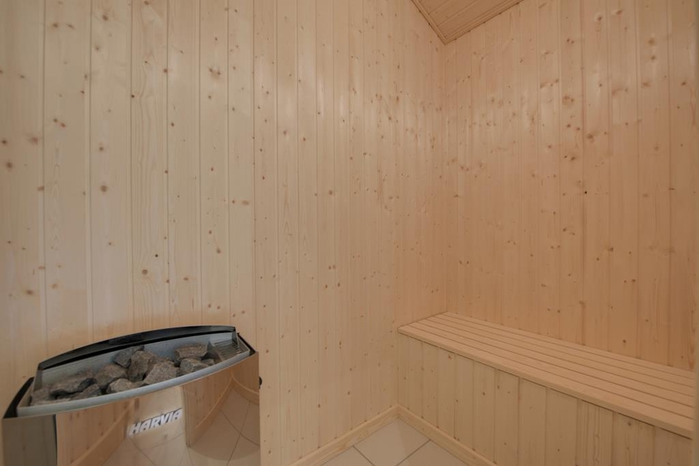 Das größere der beiden Bäder verfügt über einen Whirlpool und eine Sauna und direkten Terrassenzugang. Hier lässt es sich an kalten Abenden besonders gut entspannen. Für Wärme und Gemütlichkeit im Wohnbereich sorgt der Kaminofen. Zusätzlich kann das Haus mit der energiesparenden Wärmepumpe kostengünstig temperiert werden.