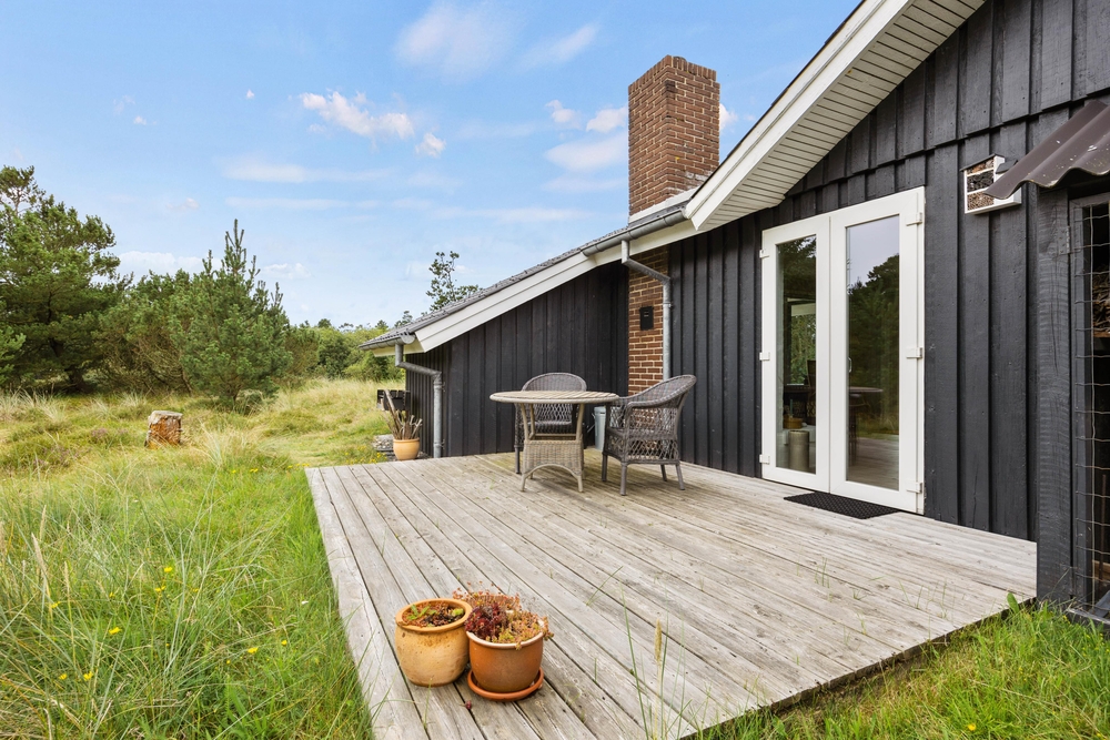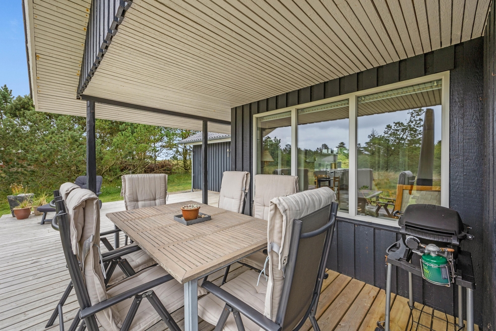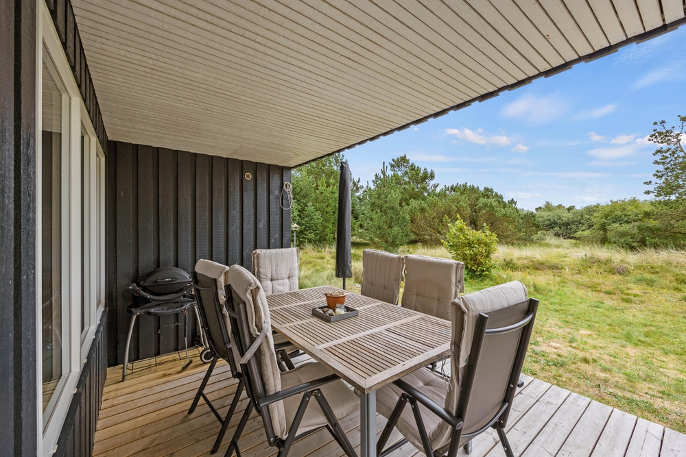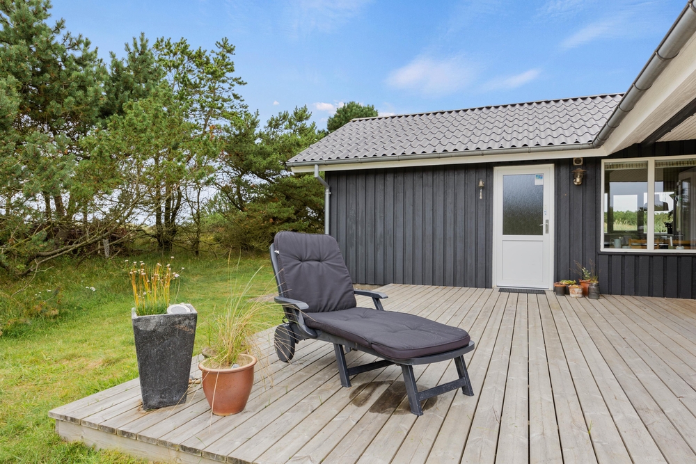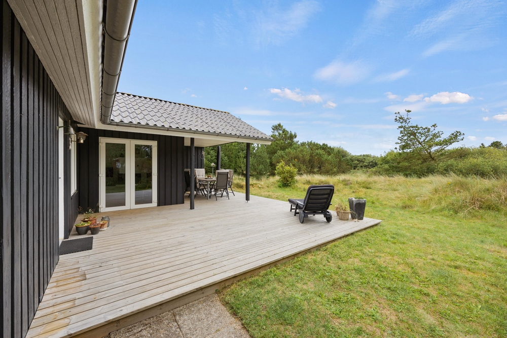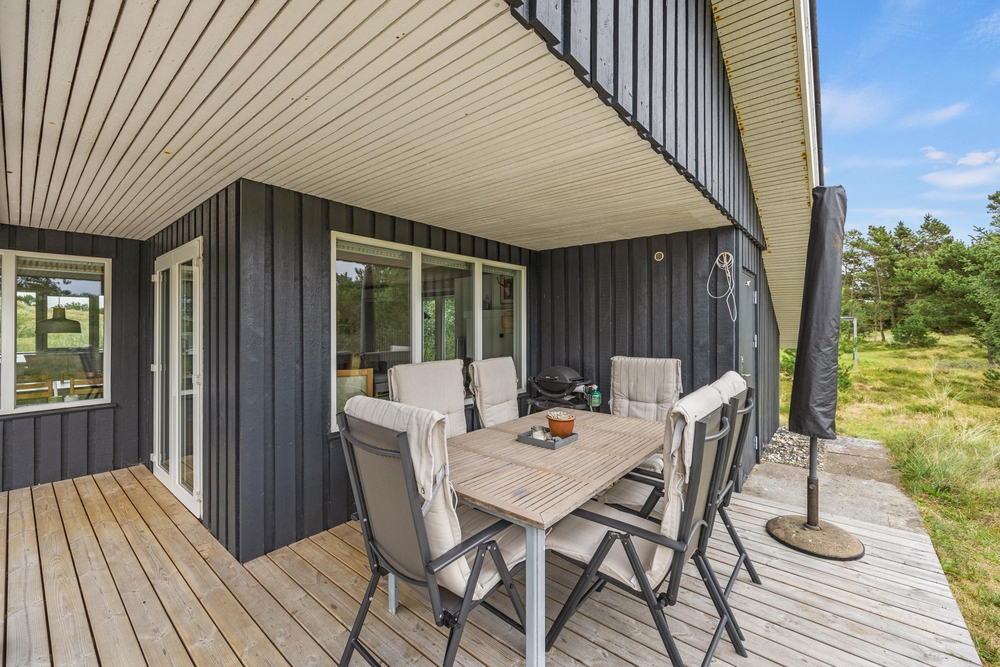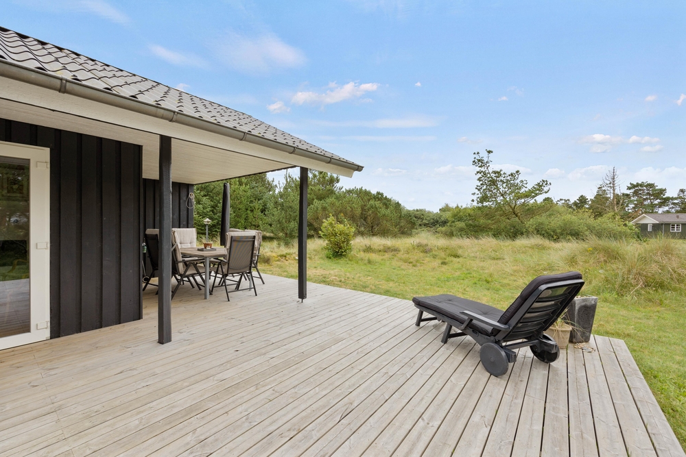 Im Außenbereich könnt Ihr die dänische Natur in vollen Zügen genießen. Auf der teilweise überdachten Terrasse stehen Liegestühle bereit, damit Ihr die Füße im Urlaub auch mal hochlegen könnt. Die ersten Sonnenstrahlen am Morgen könnt Ihr mit Eurem Kaffee auf der vorderen Terrasse genießen. Dabei habt Ihr übrigens einen traumhaften Ausblick auf die ?Kallesmærsk Hede?, ein 11.000 Hektar großes Naturschutzgebiet, in der viele verschiedene Vögel und andere Tierarten Ihren Lebensraum gefunden haben.