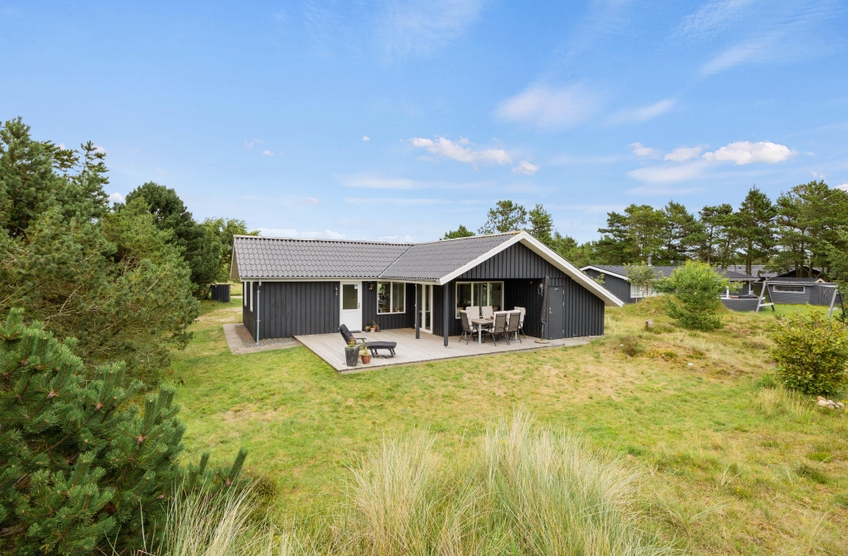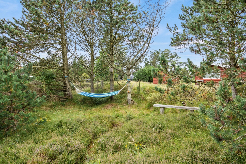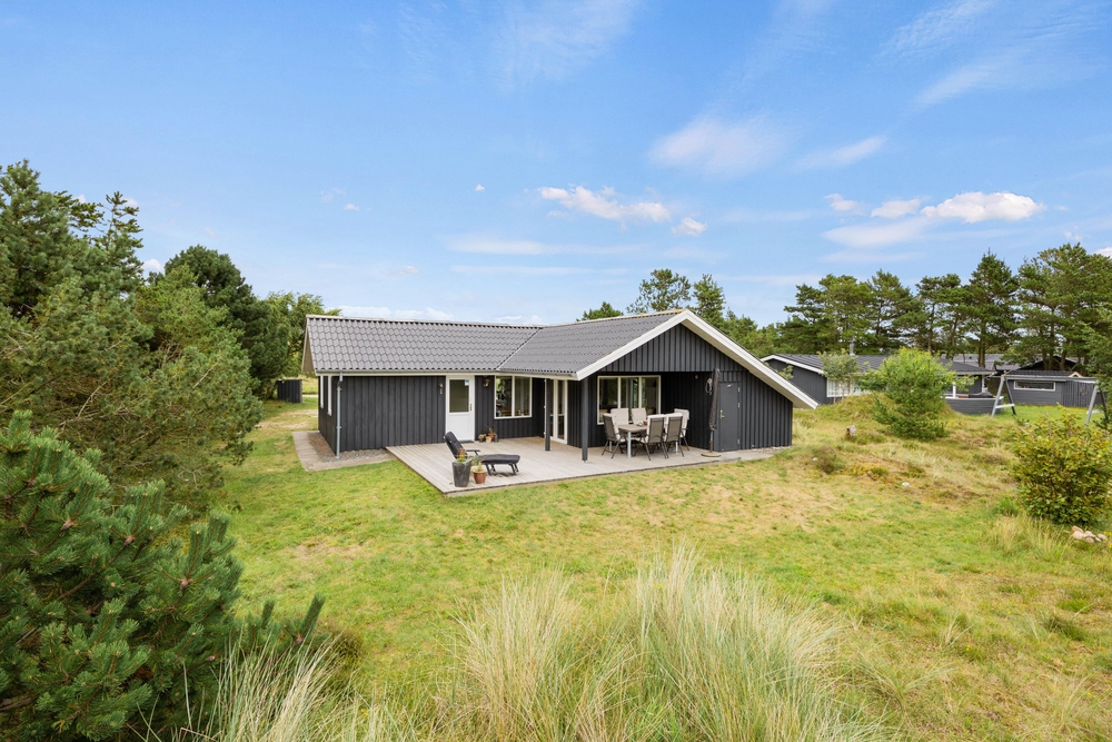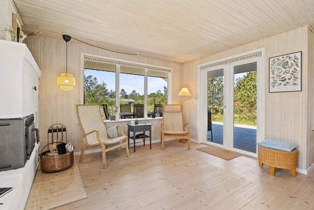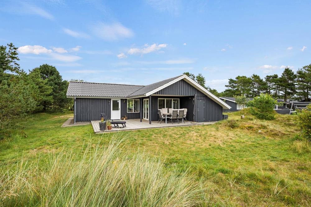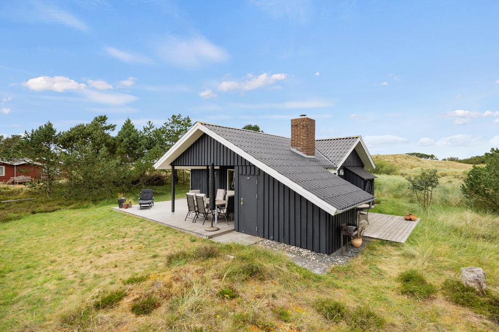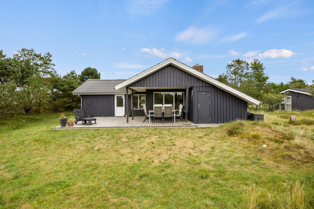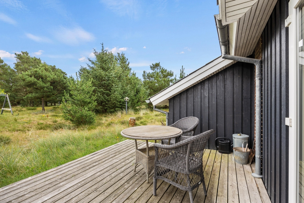 Im Außenbereich könnt Ihr die dänische Natur in vollen Zügen genießen. Auf der teilweise überdachten Terrasse stehen Liegestühle bereit, damit Ihr die Füße im Urlaub auch mal hochlegen könnt. Die ersten Sonnenstrahlen am Morgen könnt Ihr mit Eurem Kaffee auf der vorderen Terrasse genießen. Dabei habt Ihr übrigens einen traumhaften Ausblick auf die ?Kallesmærsk Hede?, ein 11.000 Hektar großes Naturschutzgebiet, in der viele verschiedene Vögel und andere Tierarten Ihren Lebensraum gefunden haben.