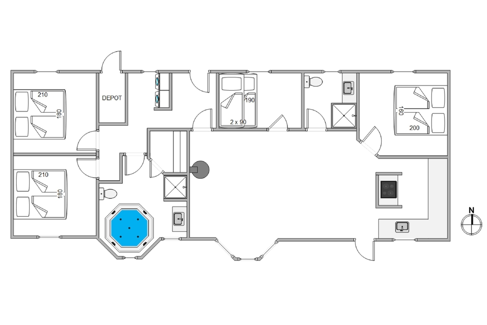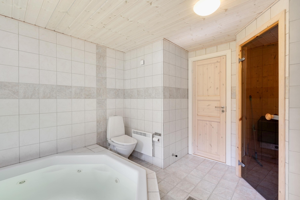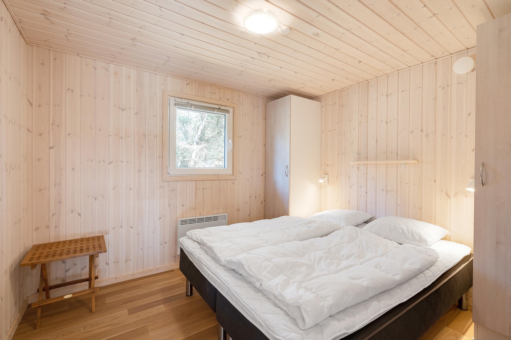 Das Ferienhaus hat 2 Badezimmer, wobei im größeren von beiden ein Standwasserwhirlpool und eine Sauna vorhanden ist. Die 4 Schlafräume haben Holzlaminatfußböden wobei sich in 3 Schlafräume je zwei Doppelbetten befinden und im Vierten steht ein Etagenbett.