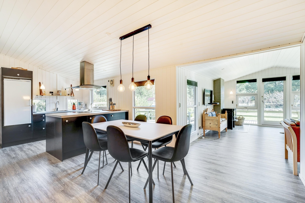 Das stimmungsvolle Ferienhaus beschert euch durch den großen Aufenthaltsraum, der sich aus Wohnzimmer, Esszimmer und Küche zusammensetzt, viele Stunden zusammen. Dort könnt ihr dann entweder am großen Esstisch zusammen Brettspiele spielen oder im Wohnbereich bei einem Glas Wein das Knistern des Holzofens genießen.