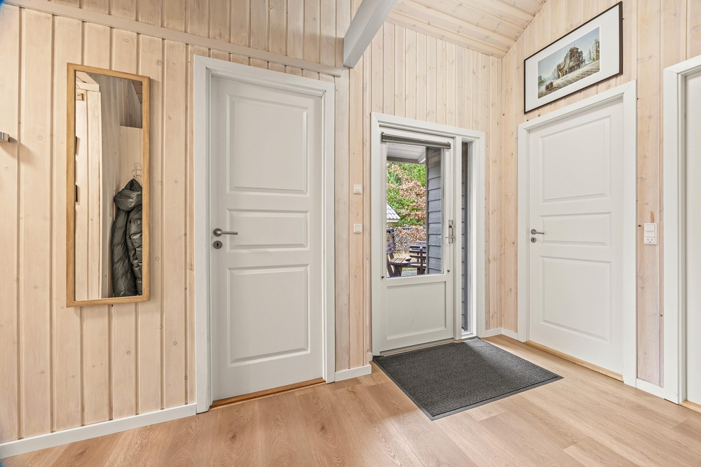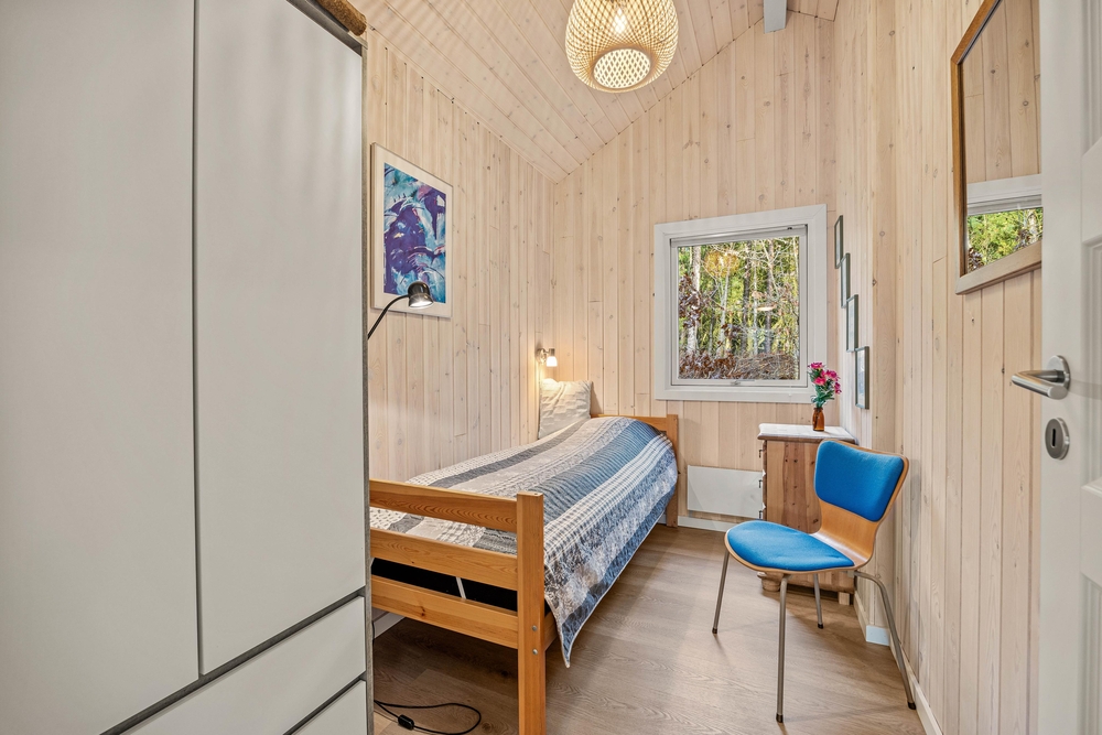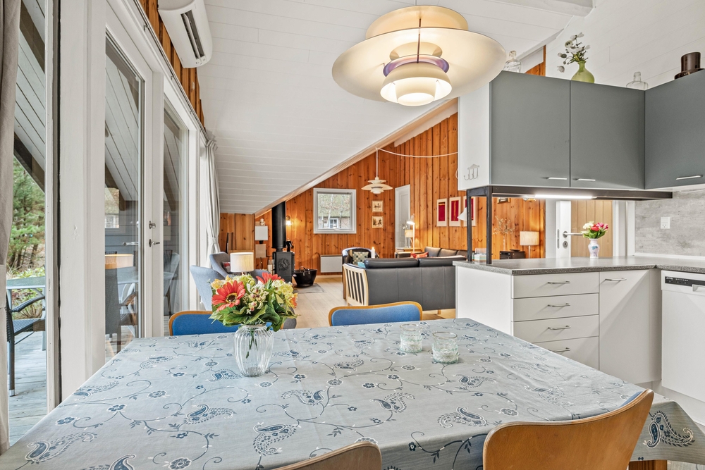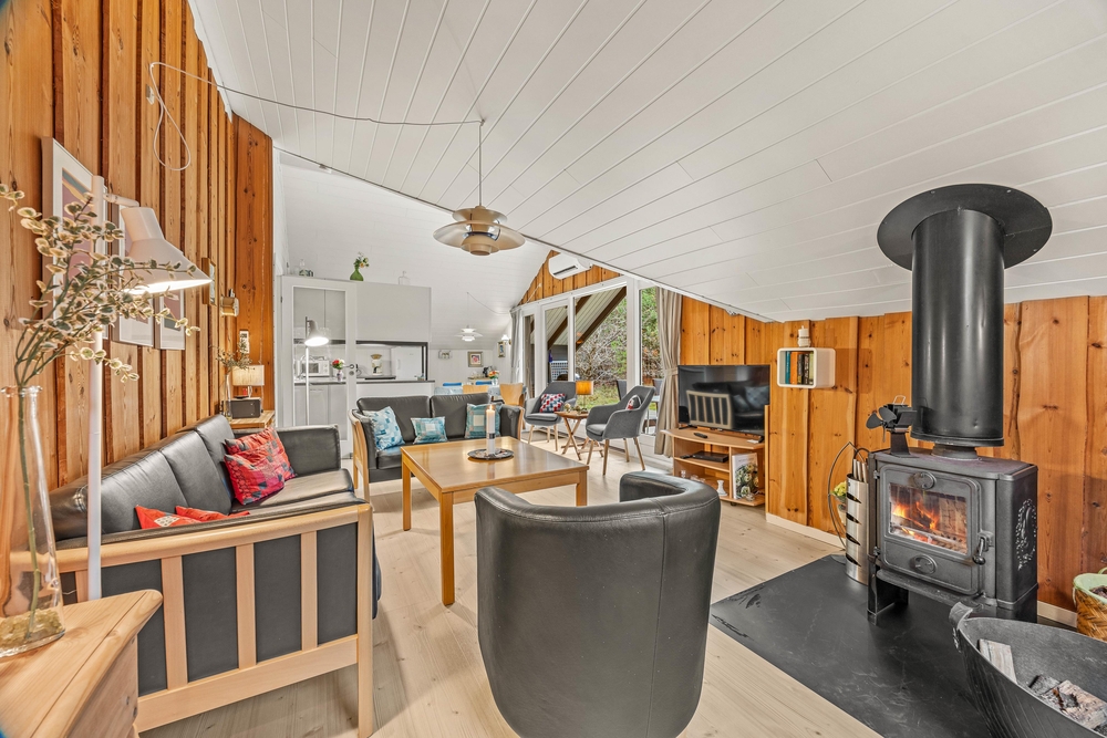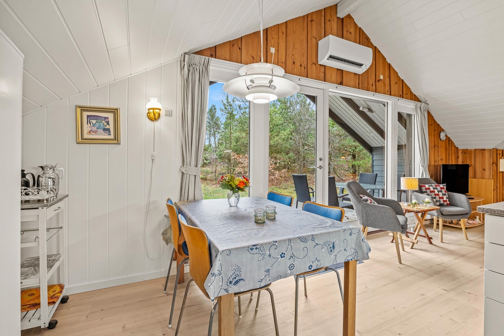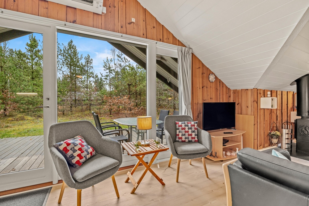 Das Ferienhaus ist mit einer energiesparenden Wärmepumpe ausgestattet, die es auch bei kühleren Temperaturen angenehm beheizt. Große Fenster lassen viel Tageslicht in den Raum und bieten einen herrlichen Blick auf den Garten und die umliegende Natur.
