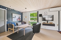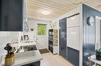 Durch die Haupteingangstür kommt man direkt in die funktionell eingerichtete Küche mit Spülmaschine. An die Küche schließt sich der offene Ess- und Wohnbereich an. Hier kann sich die ganze Familie entspannen entweder im gemütlichen Sessel vor dem Kaminofen oder in der typisch dänischen Fernsehecke. Durch die bodenlangen Fenster im Wohnbereich kann man den wunderschönen Blick in die Natur genießen oder einfach die große Schiebetür zur Terrasse hin öffnen und den Duft von Wald und Heidekraut hereinlassen.