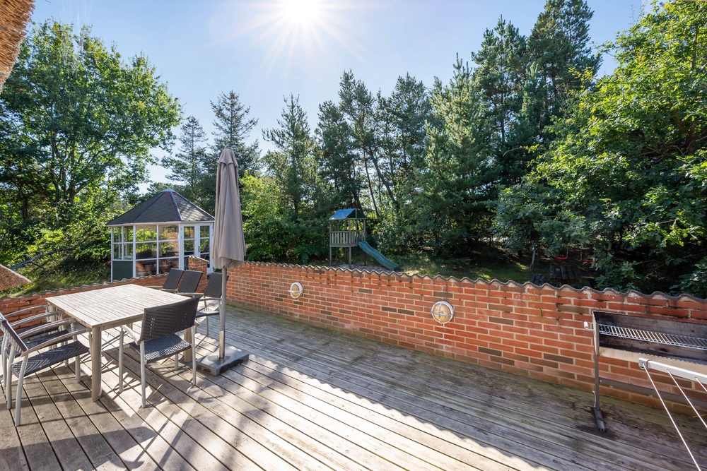 Das Ferienhaus ist mit grossen Bäumen umgeben und liegt so friedlich und ungestört auf einem sehr grossem Grundstück. Vom Wohnzimmer und Pool raum könnt ihr direkt auf die grosse Terrasse raustreten. Hier könnt ihr in ruhe den Morgen beginnen, ob Frühstück im freien oder ein Buch lesen auf den Sonnenliegen. Den Abend könnt ihr mit einem Barbecue ausklingen lassen, während die Kinder rumtoben.