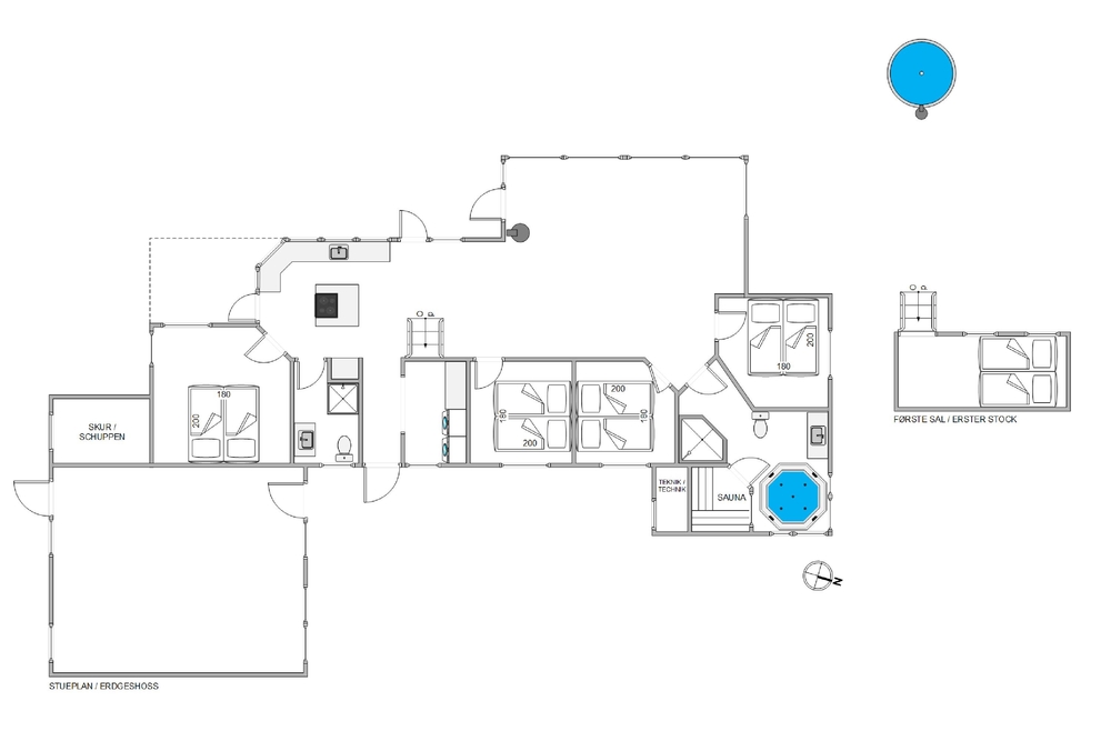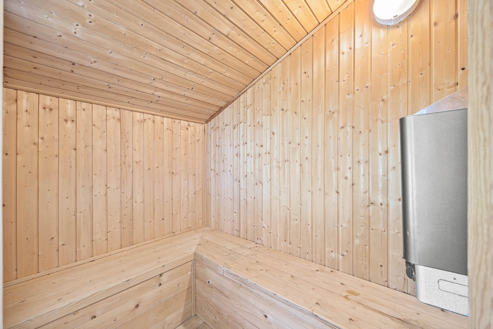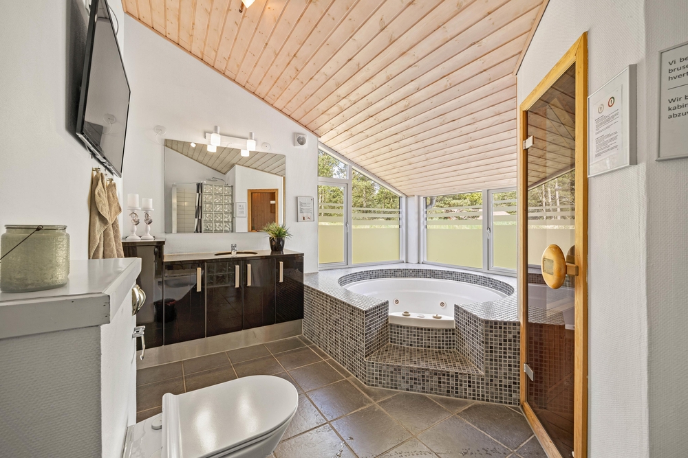 Das Ferienhaus verfügt ebenfalls über 2 Badezimmer mit Fußbodenheizung, von denen eines mit einem Whirlpool und einer Sauna für Entspannung und Wellness ausgestattet ist. Waschmaschine und Wäschetrockner sorgen für die frischen Handtücher.