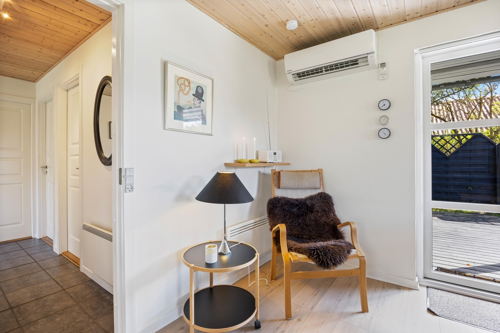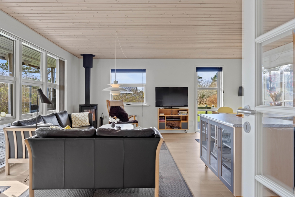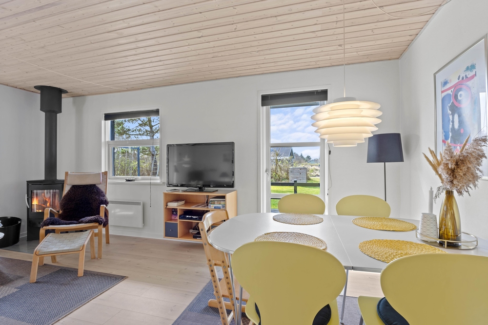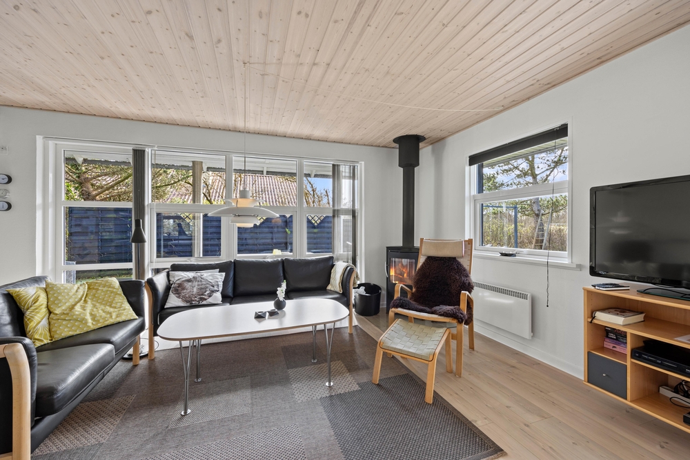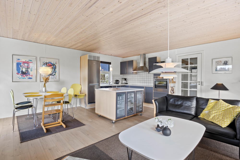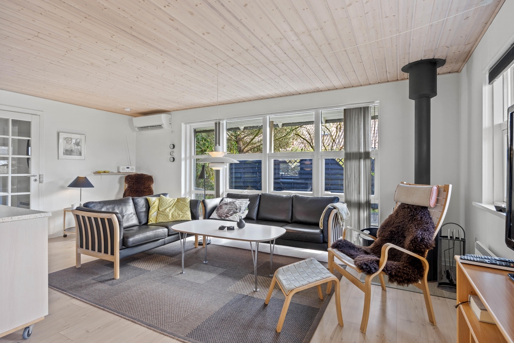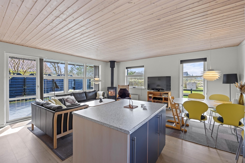 Im Heidesvej 10 empfängt euch das helle und freundliche Interieur des Ferienhauses, sobald ihre es betretet. Die großen Fenster und Glastüren mit Zugang zur Terrasse, sorgen für viel natürliches Licht im Wohnbereich. Hier können ihr es euch auf dem Sofa gemütlich machen und die Wärme des Holzofens genießen, während ihr es euch mit einer Tasse heißer Schokolade gemütlich macht. Eine energiesparende Wärmepumpe hilft, den Verbrauch für Wärme niedrig zu halten.