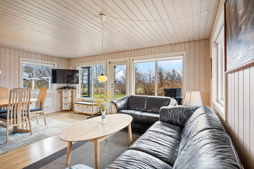 Wenn ihr das Ferienhaus betretet, werdet ihr von einer gemütlichen Einrichtung mit holzvertäfelten Wänden und Decken begrüßt, die die typische Ferienhausatmosphäre ausstrahlt. Verstärkt wird die Ferienhausatmosphäre, wenn ihr den Kamin im Wohnzimmer anfeuert und dem Knistern des Feuers lauscht. Die Küche, das Wohnzimmer und der Essbereich sind offen miteinander verbunden, sodass ihr hier eure Zeit gemeinsam verbringen könnt, ob vielleicht gemütlich vor dem Smart-TV oder bei einem lustigen Spieleabend.