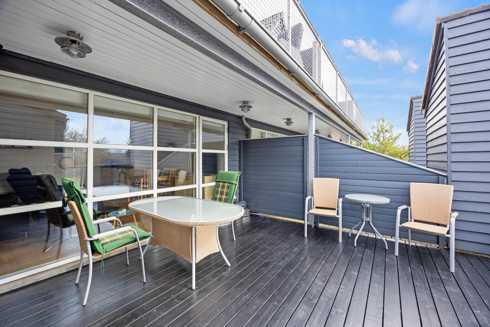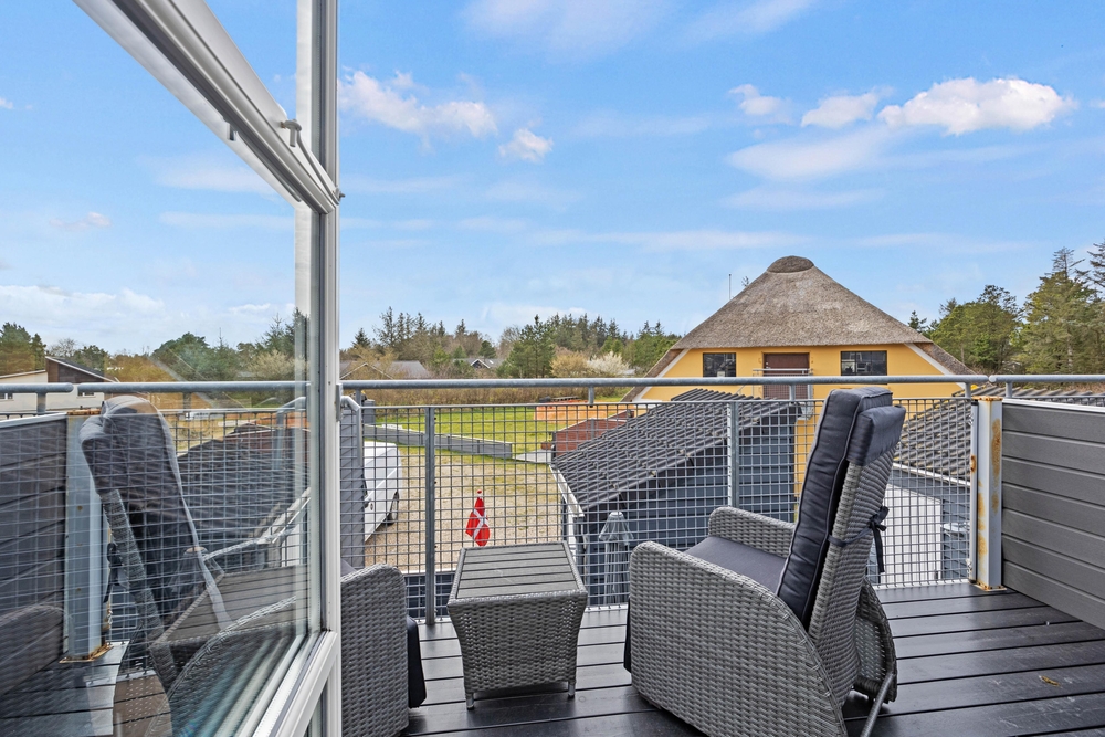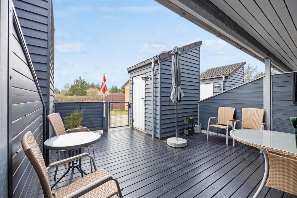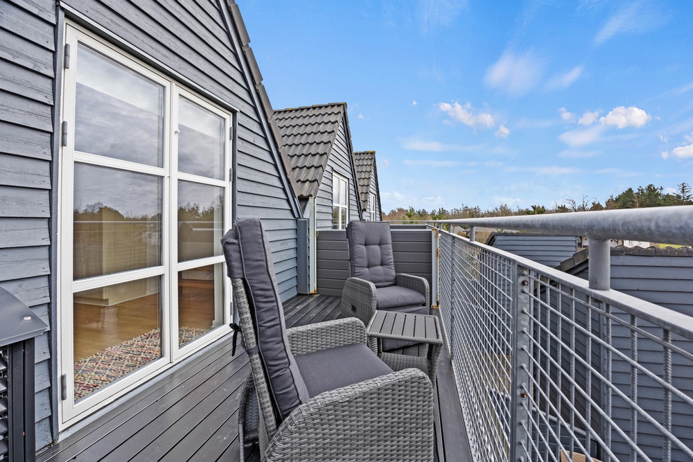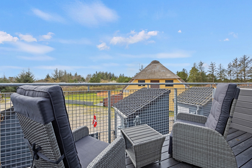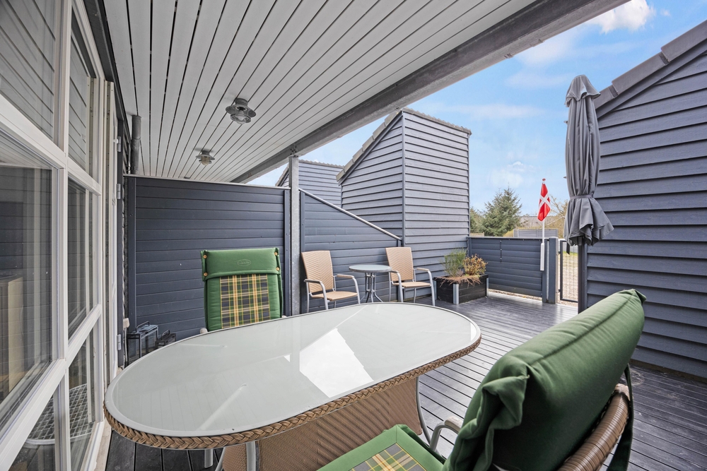 Auf dem Balkon könnt ihr den ersten Kaffee des Tages mit Vogelgezwitscher im Hintergrund genießen oder beobachten, wie die Sonne am Horizont verschwindet. Unterhalb des Balkons befindet sich eine schöne Holzterrasse, die eingezäunt und teilweise überdacht ist. Vom Wohnzimmer aus habt ihr Zugang zu dieser Terrasse, wo sich auch der Grill des Hauses befindet.