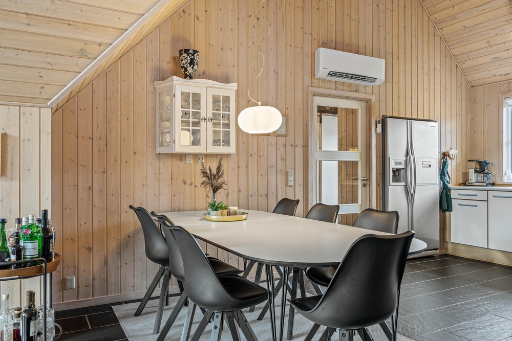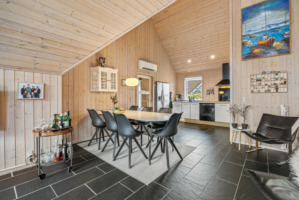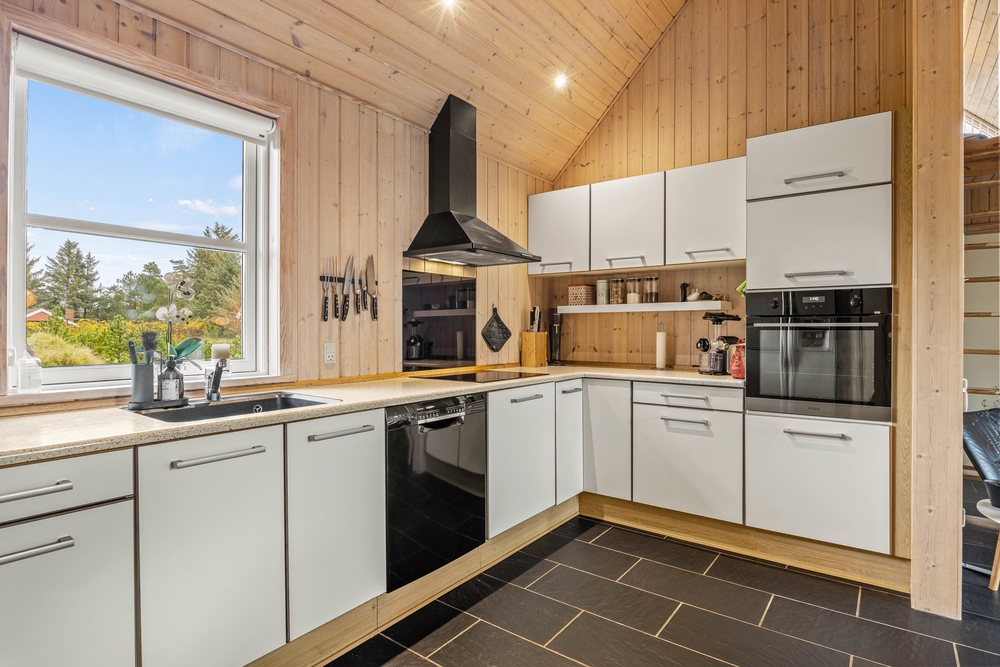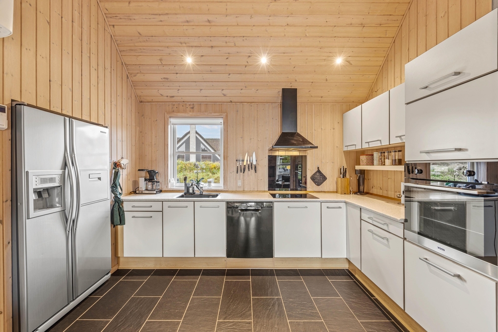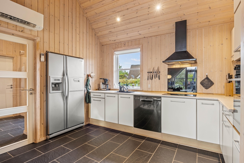 Im Hestehaven 12B kommt ihr sofort in die richtige Urlaubsstimmung, wenn ihr das schöne Ferienhaus betretet. Die stilvolle Einrichtung zieht sich durch alle Räumlichkeiten, wie ein roter Faden. Der offene Wohnbereich, mit Esstisch und Küche wird durch die hohen ausgebauten Dachschrägen und die giebelhohen Fenster zum Garten, in eine besonders freundliche Atmosphäre getaucht. Die moderne Küche, mit eingebauten, großen Kühlschrank, lädt zum kulinarischen Kochevent ein.