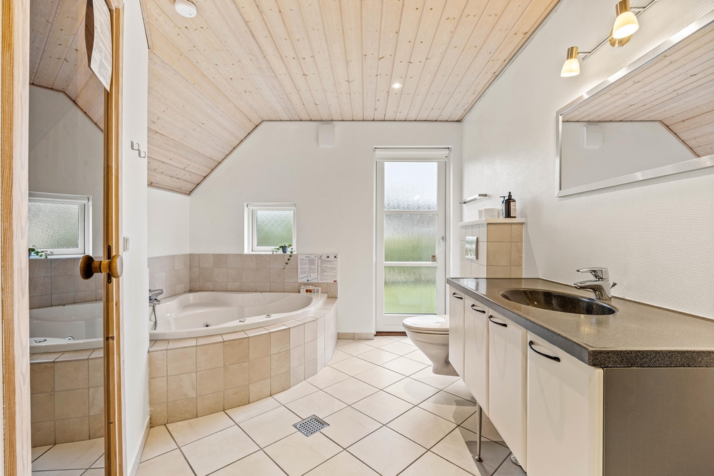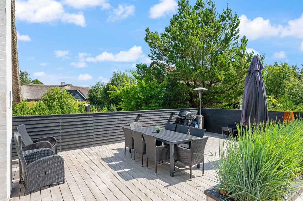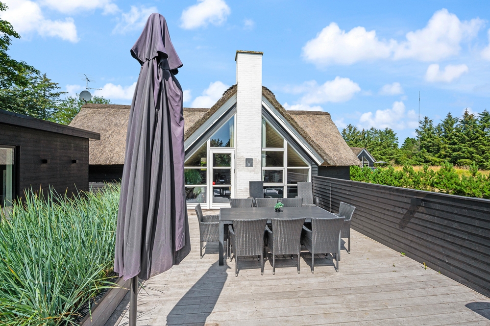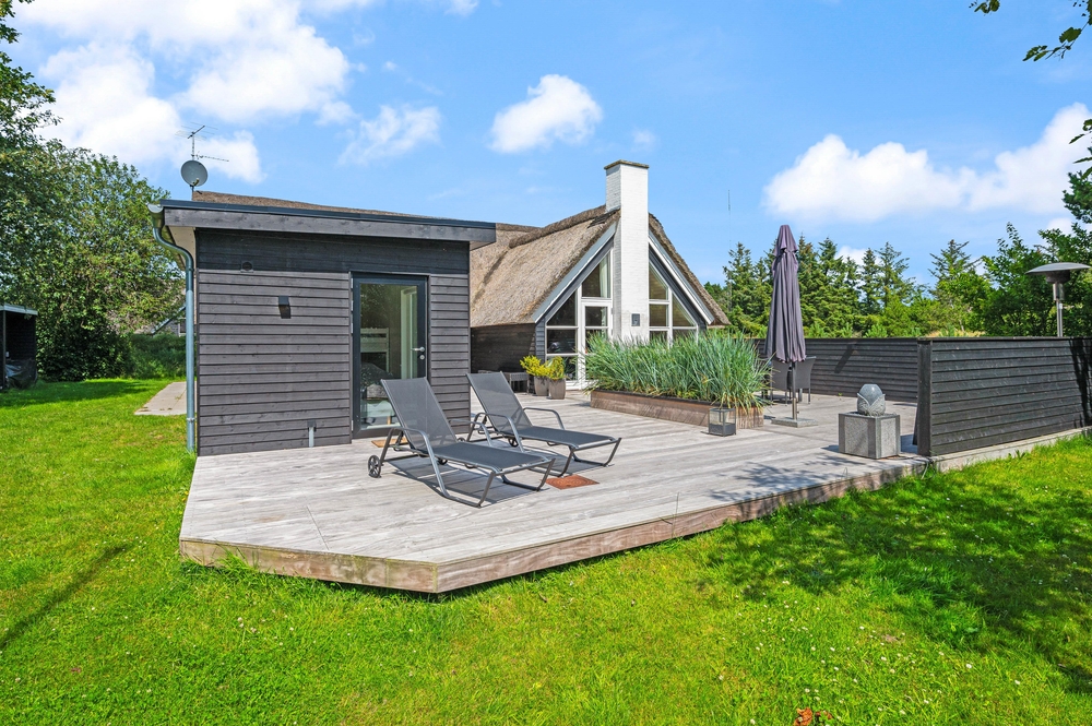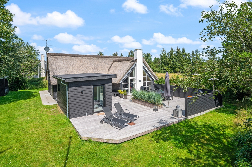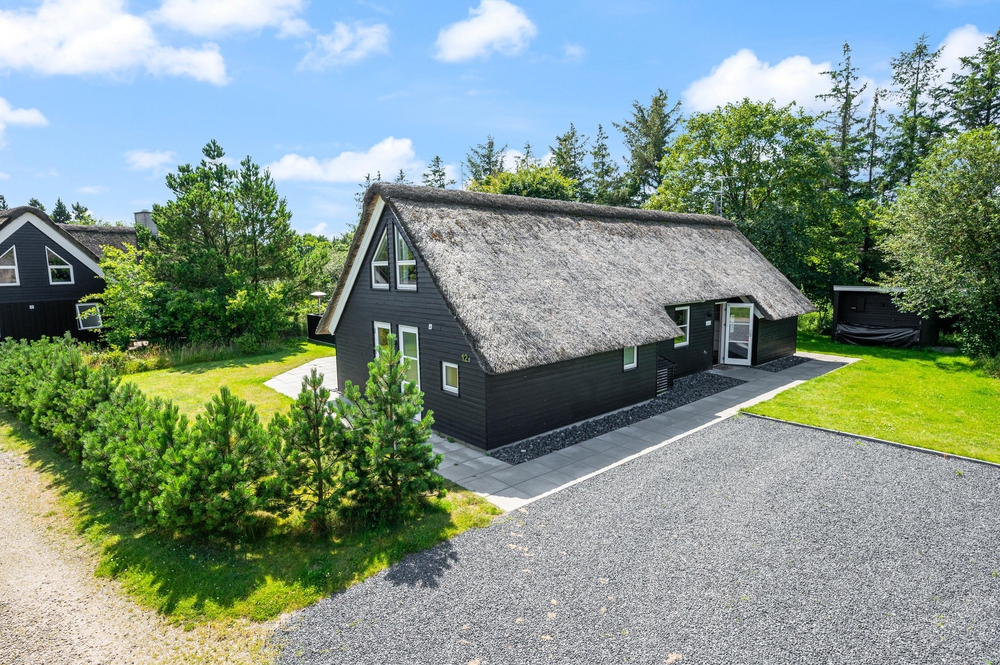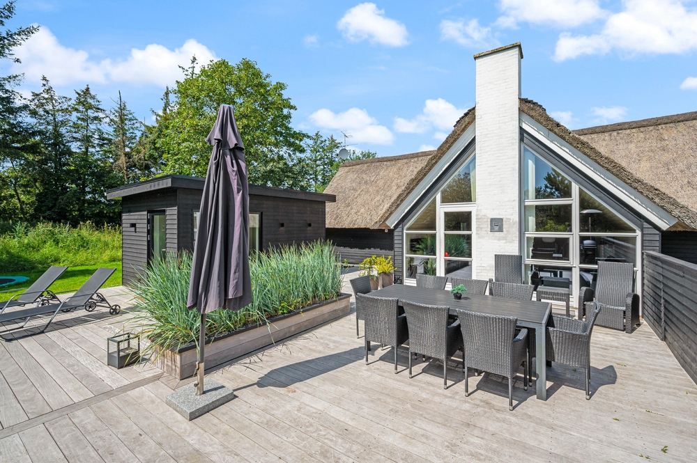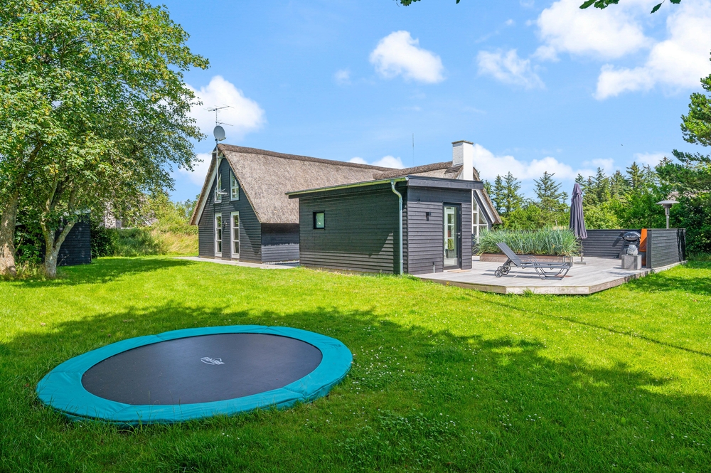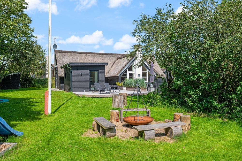 Im Hestehaven 12B erwartet euch ein modernes Reetdach Haus, in dem bis zu 8 Personen Urlaub machen können. In der besonderen Atmosphäre mit den hohen, ausgebauten Dachschrägen und der stilvollen Einrichtung fühlt man sich sofort wohl. Kleine und große Gäste kommen hier voll auf ihre Kosten, mit Schaukeln und Trampolin im Garten, und Sauna und Whirlpool im Bad. Das passende Ferienhaus für Familien mit Kindern.