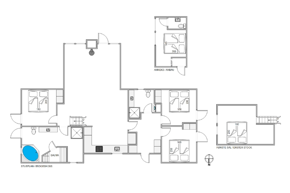 Das Ferienhaus hat 3 Schlafzimmer mit bequemen Doppelbetten. Ein weiteres Doppelbett steht auf dem ausgebauten Dachboden, wo bestimmt die Kids ihr Lager aufschlagen möchten. Über die Terrasse rüber, steht noch ein Annex mit einem Doppelbett und einem kleinen Bad mit Toilette.