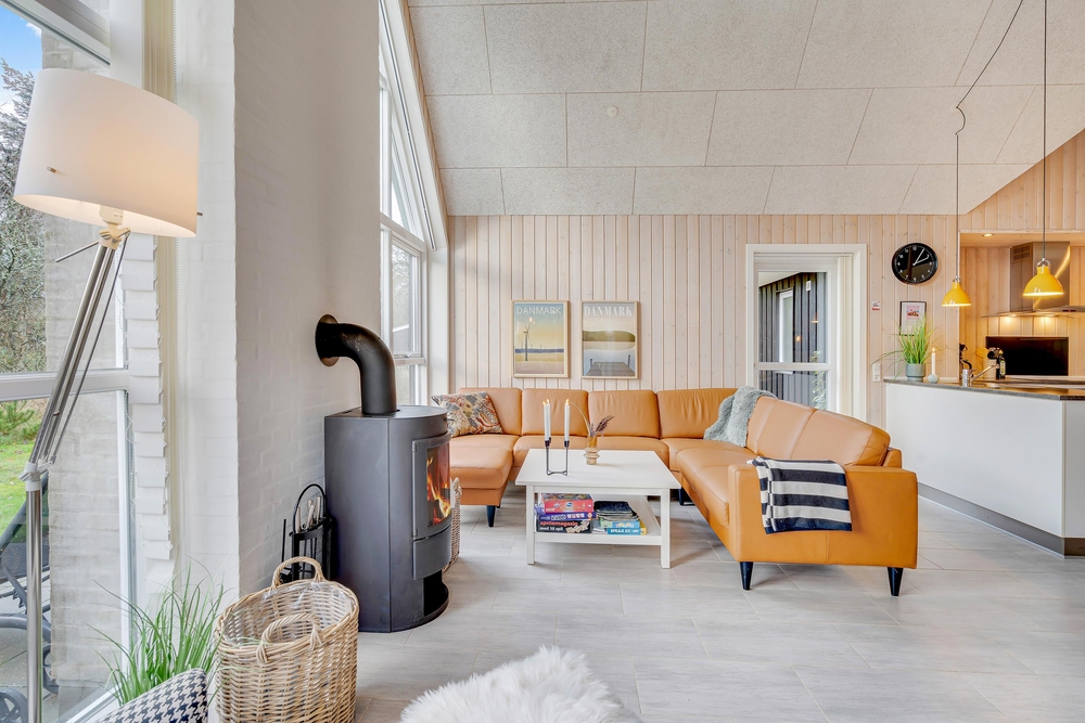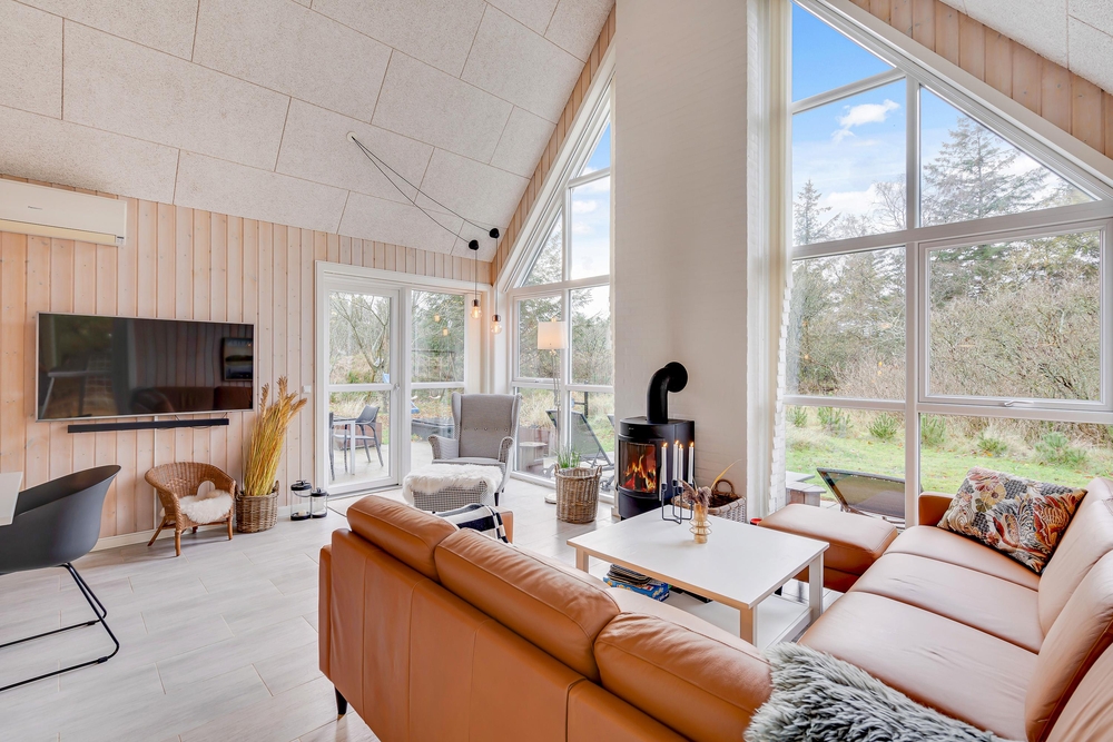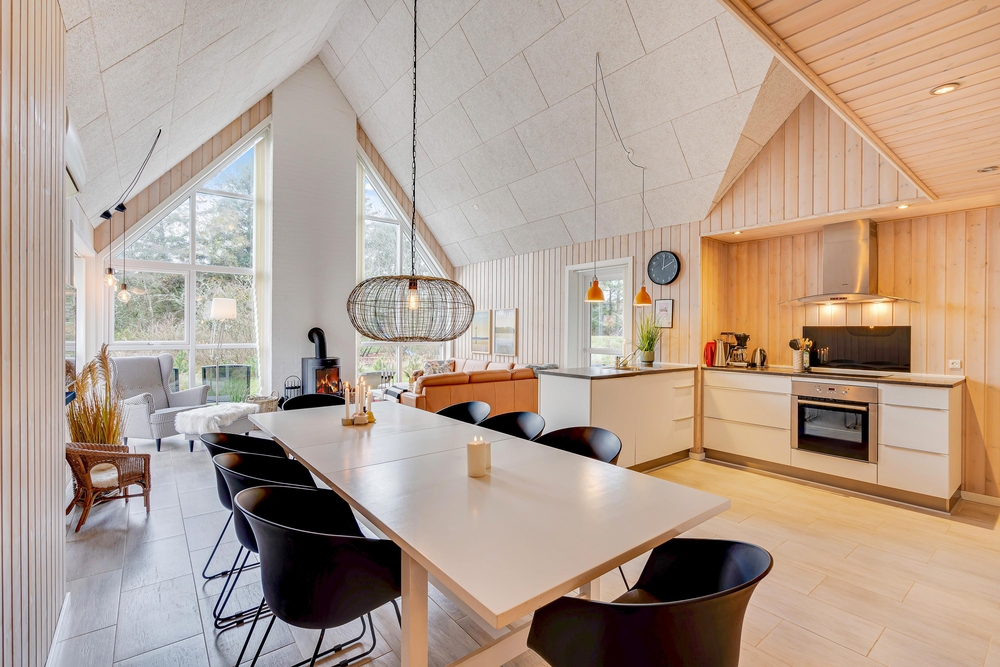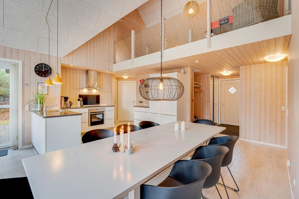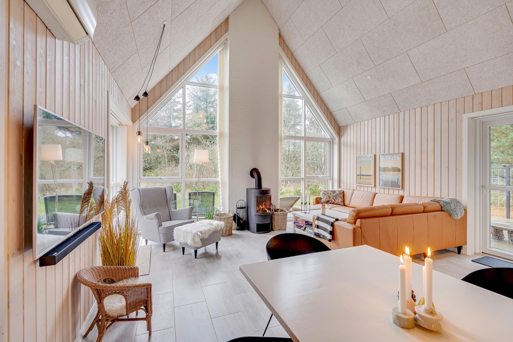 Die hohen Decken spiegeln ein großzügiges Raumgefühl wider und die Galerie, welche zu den oberen Räumen führt, scheint durch die gekonnte Bauweise mit viel Glas über euren Köpfen zu schweben. Beheizt wird das Ferienhaus mit einer energiesparenden Wärmepumpe wobei alternativ auch der Kaminofen für eine angenehme Wärme, besonders an kühleren Abenden sorgt.