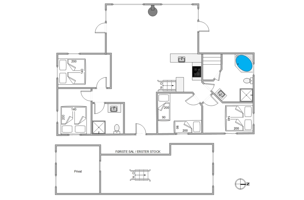 Die beiden Badezimmer, welche jeweils über eine Fußbodenheizung verfügen, sowie die 4 Schlafzimmer befinden sich im Erdgeschoss des Ferienhauses. Hier findet ihr also ausreichend Platz für die große Familie oder aber für einen Urlaub mit euren Freunden. Der offene Wohn- und Essbereich mit der hellen und offenen Küche bildet das Zentrum dieses gemütlichen Hauses.
