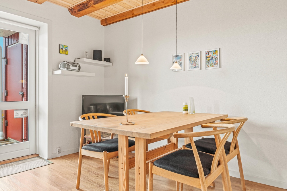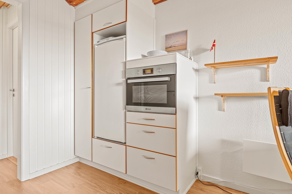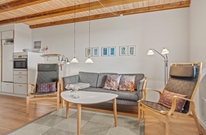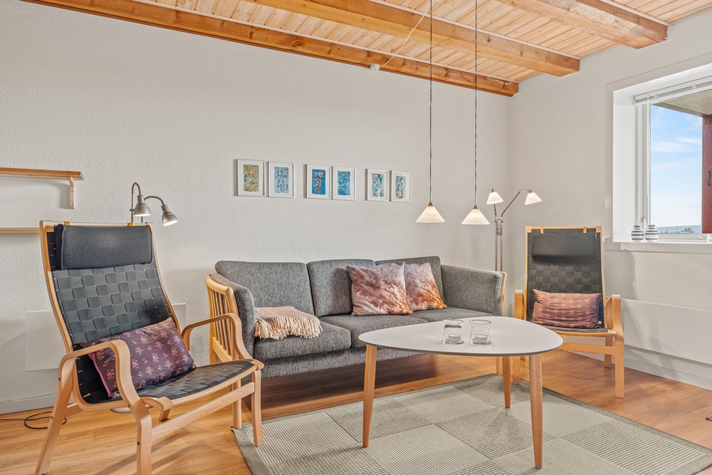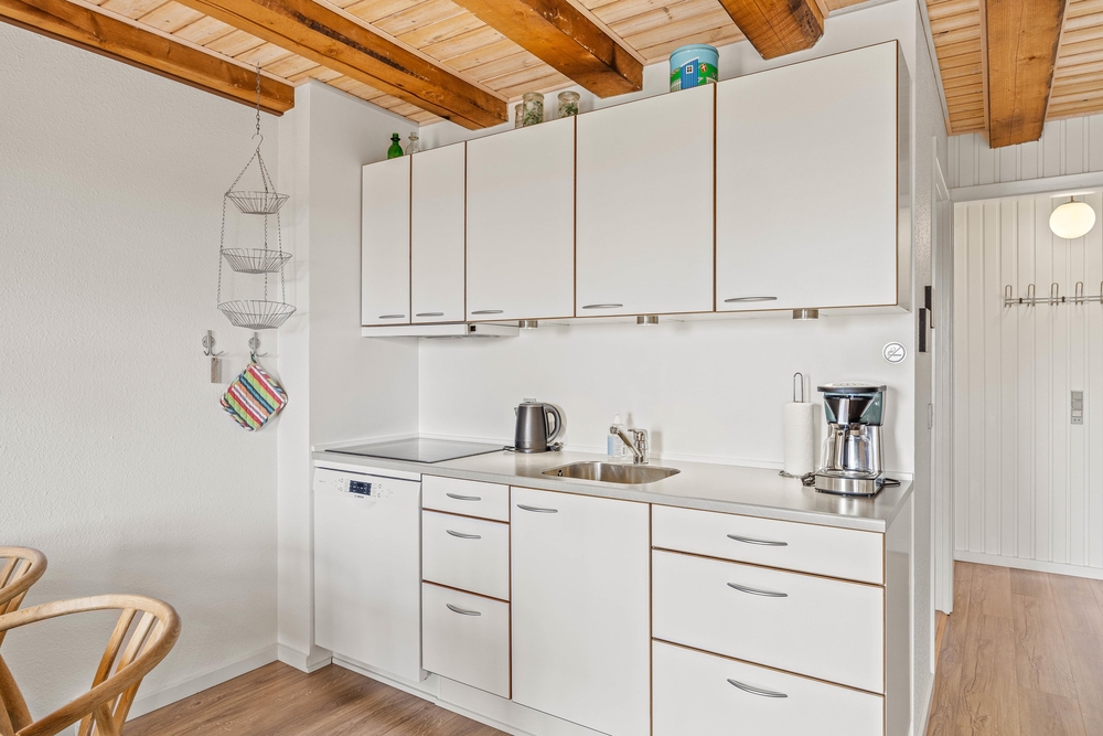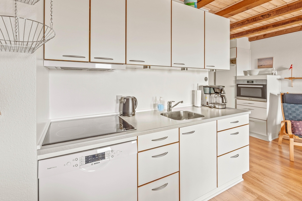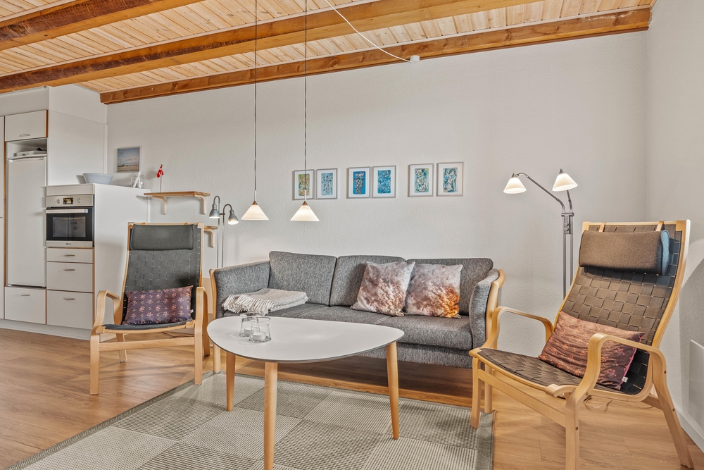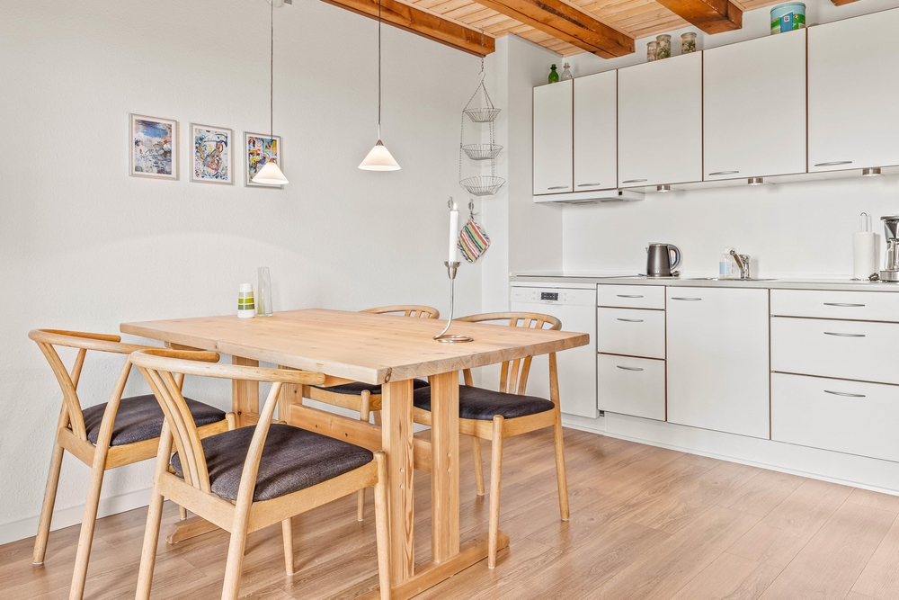 Sobald ihr euer Auto auf dem Gemeinschaftsparkplatz geparkt habt, müsst ihr nur noch die Treppe hochsteigen und schon könnt ihr die atemberaubende Aussicht über Henne Strand genießen. In Wohnung 7 kommt ihr im Wohnraum rein, der eine Kombination aus Küche, Essbereich und Wohnbereich ist. Hier könnt ihr viele schöne Stunden mit der ganzen Familie verbringen.
