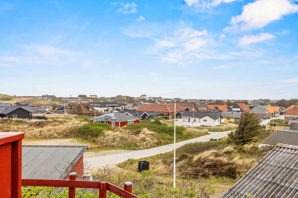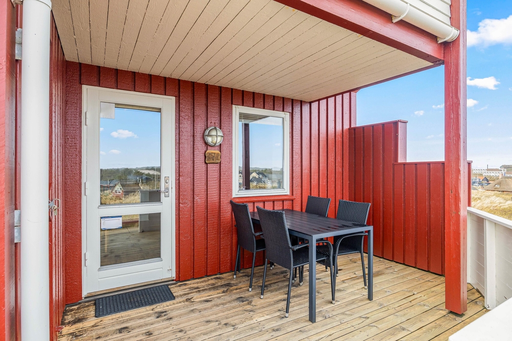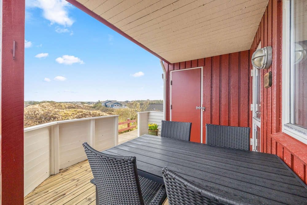 Durch die hohe Lage des Gebäudes, habt ihr von eurer überdachten Holzterrasse aus eine fantastische Aussicht über Henne Strand. Hier könnt ihr euch zum gemeinsamen Frühstück versammeln, die nächste Einkaufsmöglichkeit ist nun 200m entfernt. Über Tag könnt ihr es euch mit einem Buch gemütlich machen oder die frische Tasse Kaffee genießen, während ihr den Blick schweifen lasst. Das ist eine Wohltat für die Seele, die ihr hier einfach mal baumeln lassen könnt.