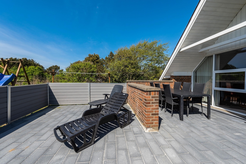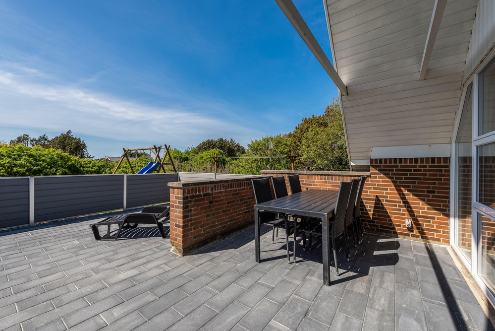 Vom Wohnzimmer aus gibt es einen direkten Zugang zur geschlossenen Terrasse. Hier findet ihr Gartenmöbel, Liegestühle und einen Grill. Während ihr euren Grillabend vorbereitet, ein Sonnenbad auf den Liegestühlen nehmt oder einfach einen Kaffee unter freiem Himmel genießt, können sich die Kinder auf der Schaukel und im Sandkasten vergnügen.